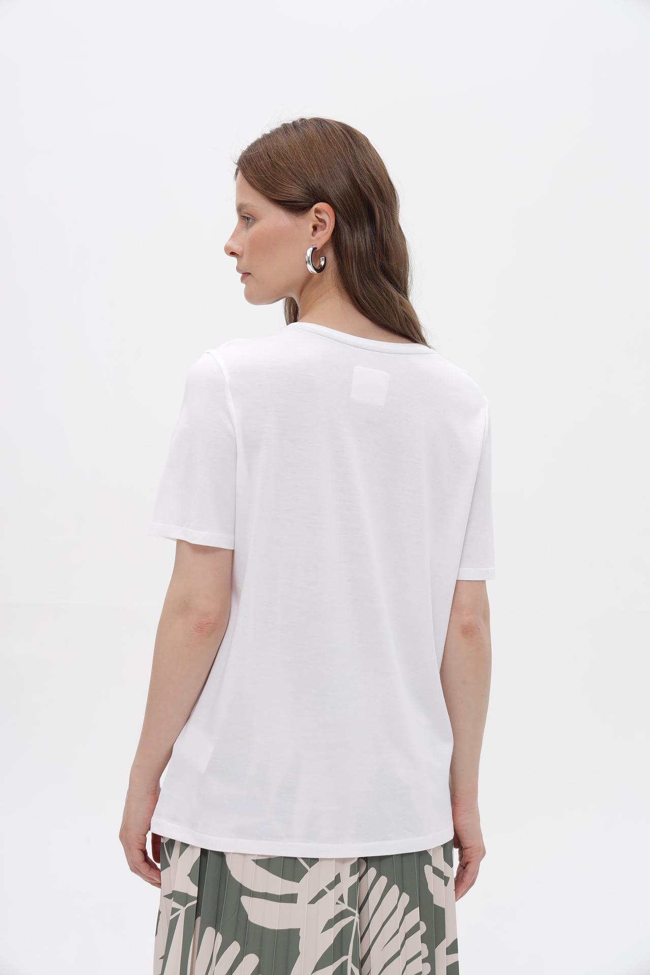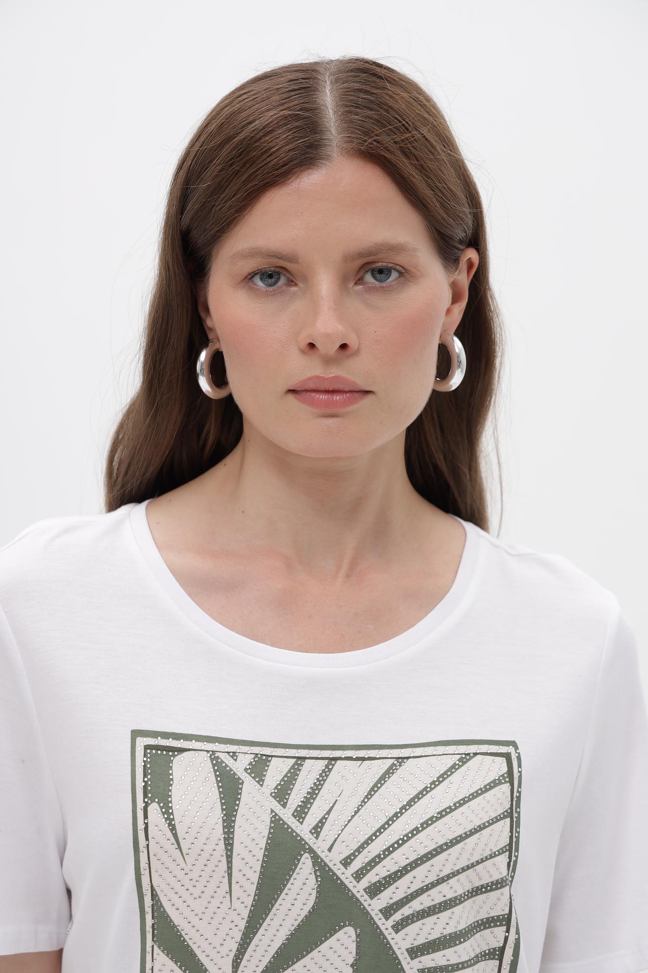 - Стильный дизайн: Лаконичный белый цвет дополнен выразительным принтом с растительными мотивами. Такой дизайн позволяет легко сочетать футболку с различными элементами гардероба, от юбок до джинсов.