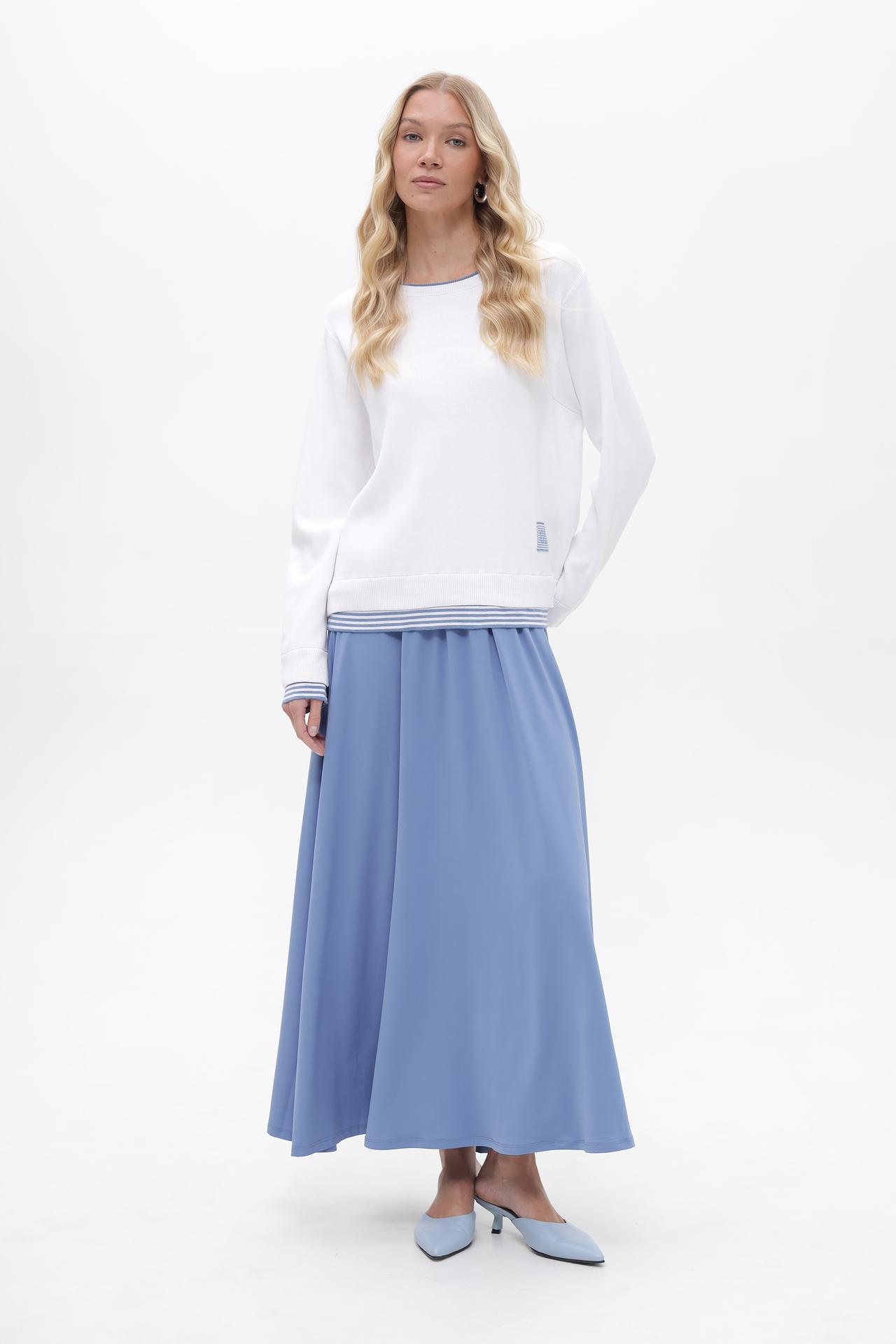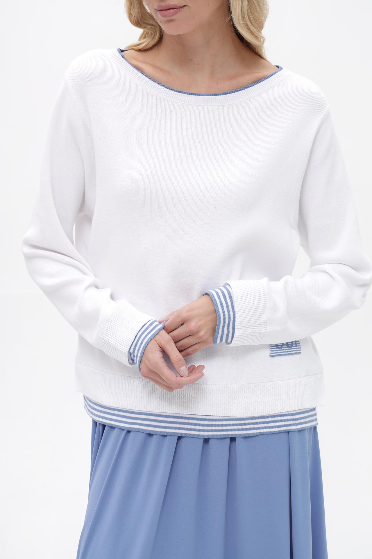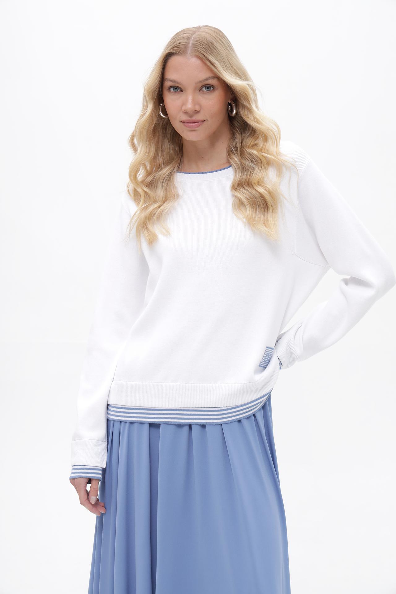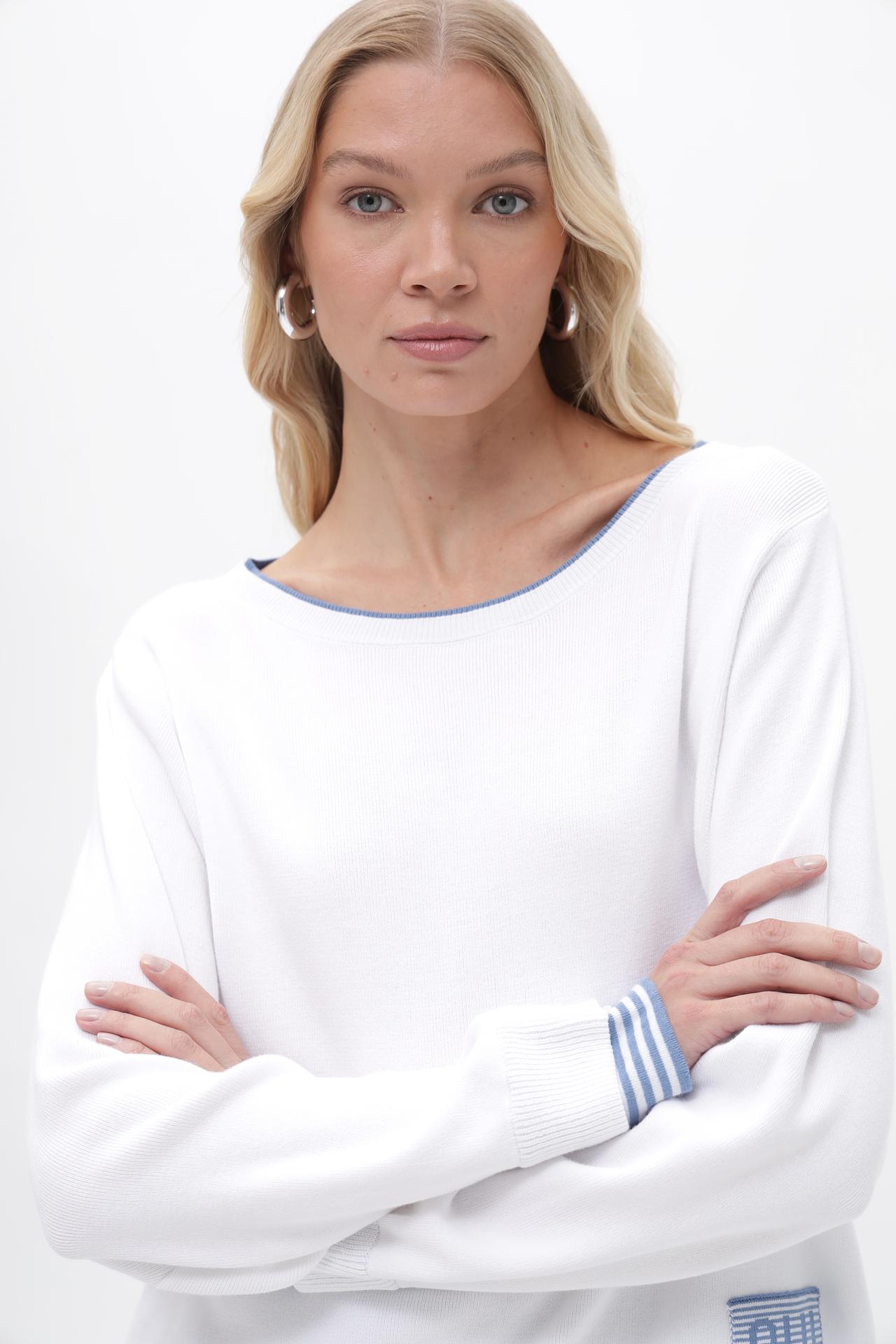 - Классический дизайн. Модель выполнена в универсальном белом цвете с круглым вырезом горловины, подчеркнутым тонкой голубой окантовкой. Это позволяет легко комбинировать пуловер с различными элементами гардероба.