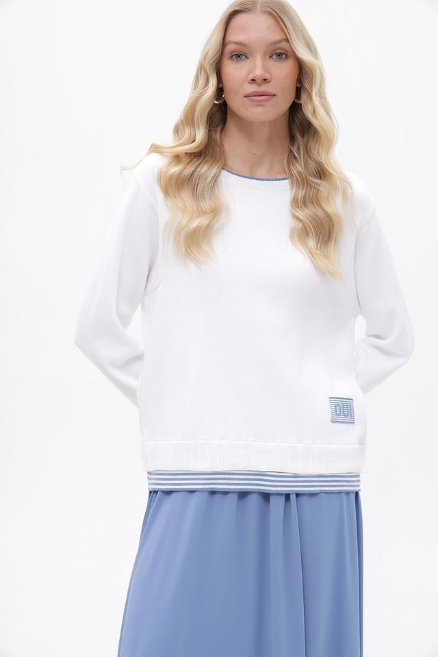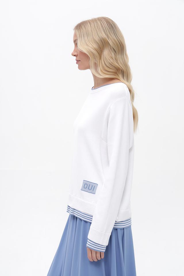 Особенностью модели является контрастная полоска на манжетах рукавов и по нижнему краю изделия, выполненная в голубых тонах. Также пуловер украшен небольшим квадратным патчем с полосатым рисунком на левой стороне. Круглый вырез горловины дополнен тонкой голубой окантовкой.