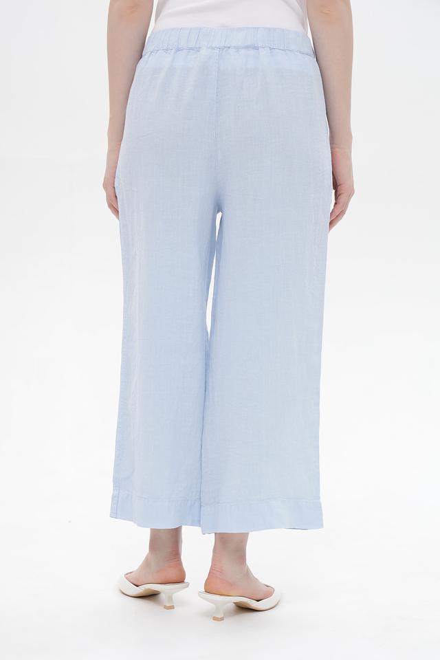 Женские брюки клёш от Oui голубого цвета, выполнены из 100% льна. Модель с эластичным поясом и боковыми карманами обеспечит комфорт в жаркую погоду. Состав: лен 100%