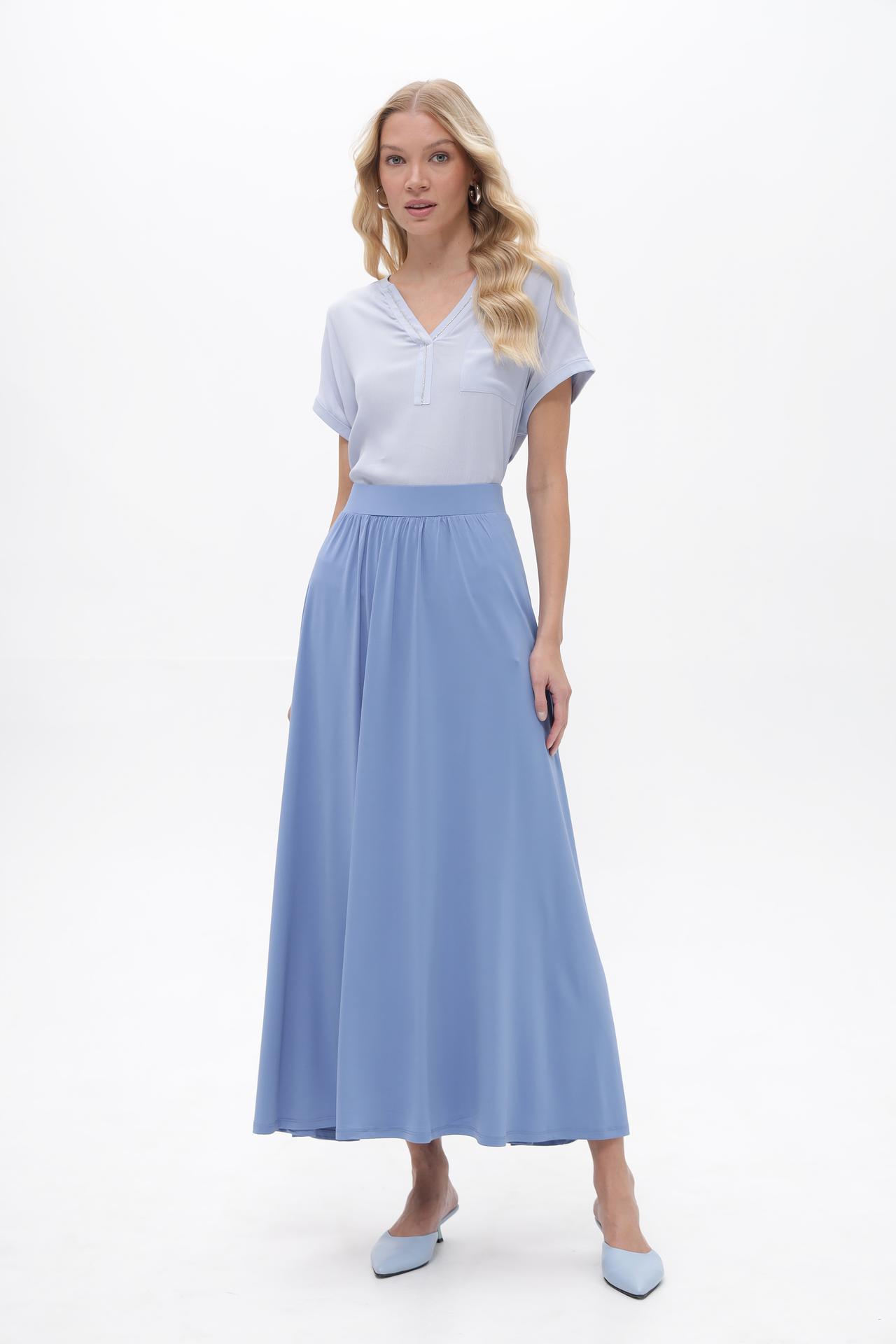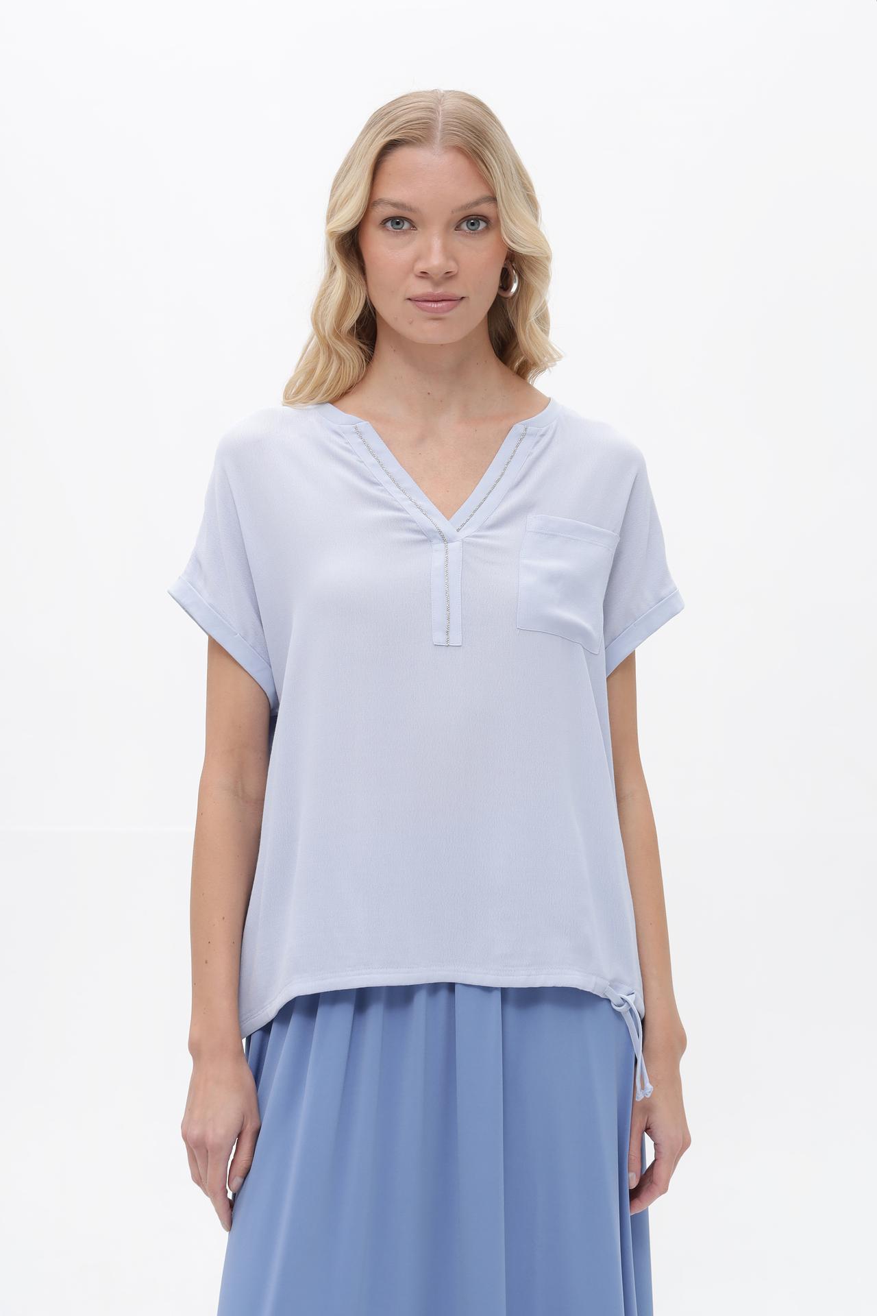 Классический крой с короткими рукавами и V-образным вырезом горловины делает эту блузу универсальной и подходящей для различных случаев. Нежный голубой цвет добавит свежести вашему облику. Небольшой нагрудный карман придает изделию особый шарм.