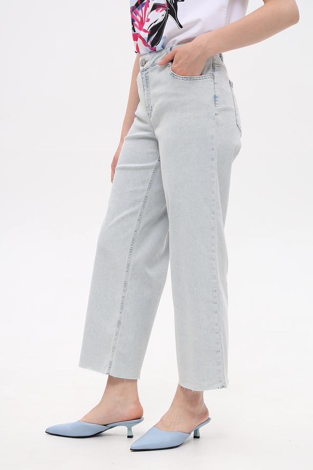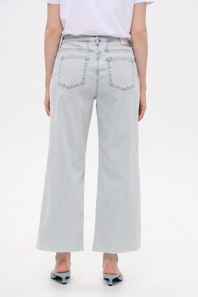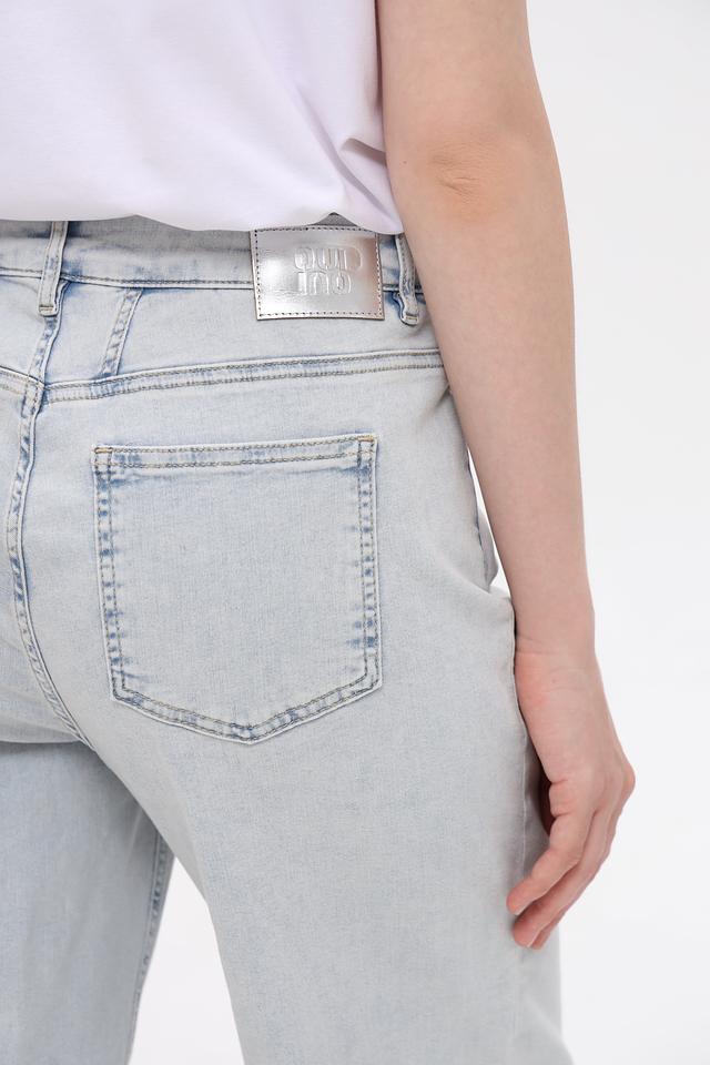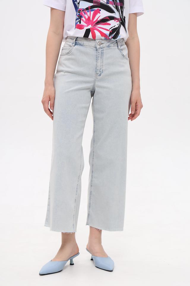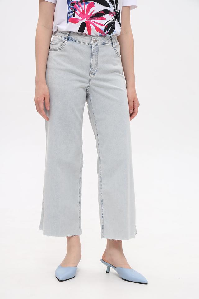 Капри имеют высокую посадку, которая визуально удлиняет ноги и подчеркивает талию. Классический пятикарманный дизайн дополнен небольшими потертостями и необработанным краем, что придает образу непринужденность. Застежка на пуговицы и молнию.