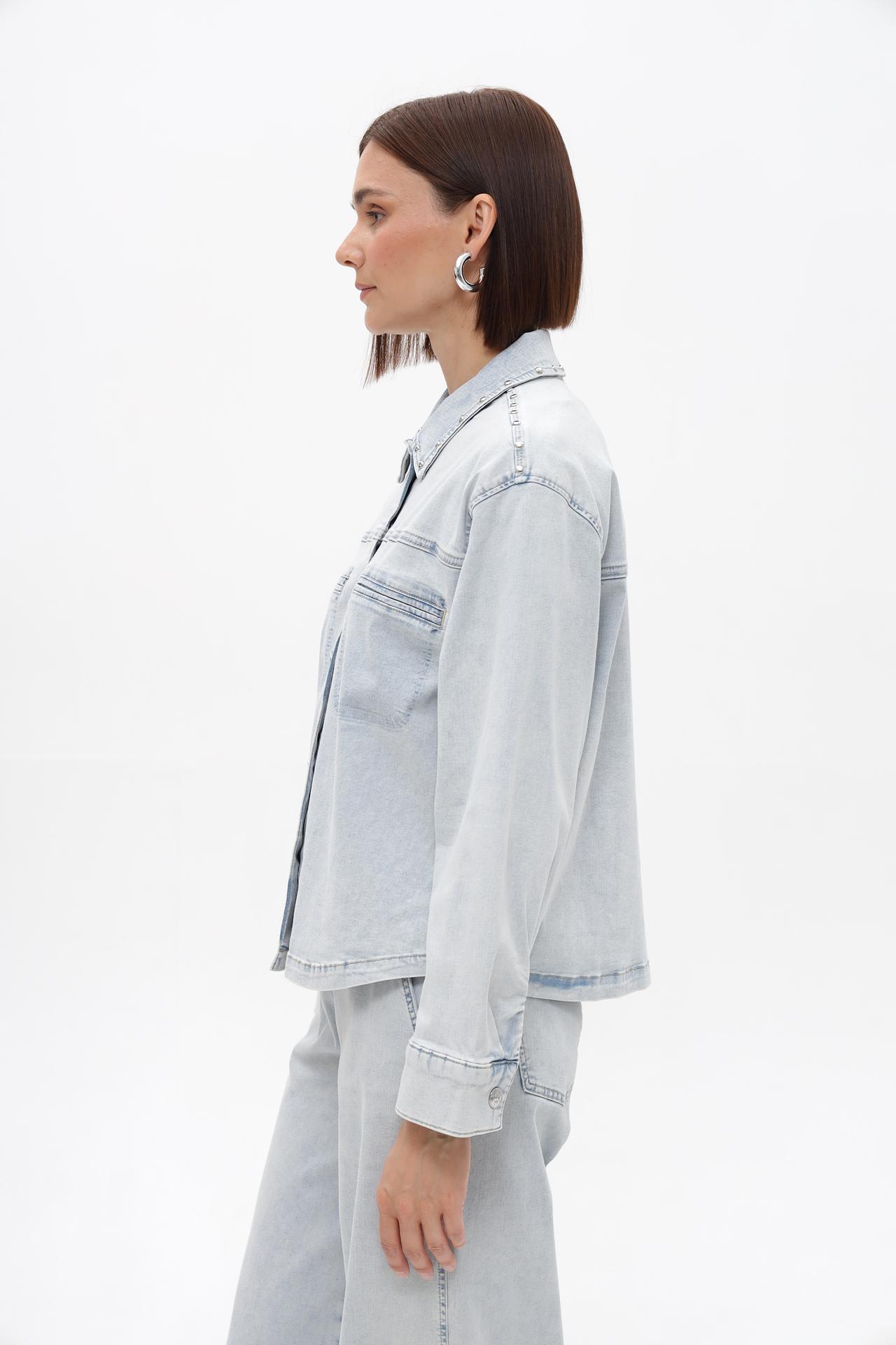 - Дизайнерские детали. Классический прямой крой дополнен эффектными металлическими заклёпками, расположенными на воротнике и линии плеч. Крупные металлические пуговицы и функциональные накладные карманы на груди завершают образ, придавая жакету индивидуальность.
