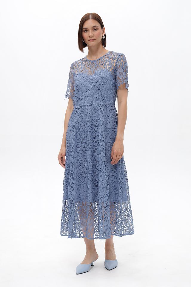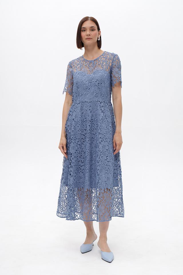 Платье от Oui голубого цвета выполнено из изящного кружева. Модель длиной миди с короткими рукавами и округлым вырезом горловины станет отличным выбором для создания элегантного образа. Состав: полиэстер 100%