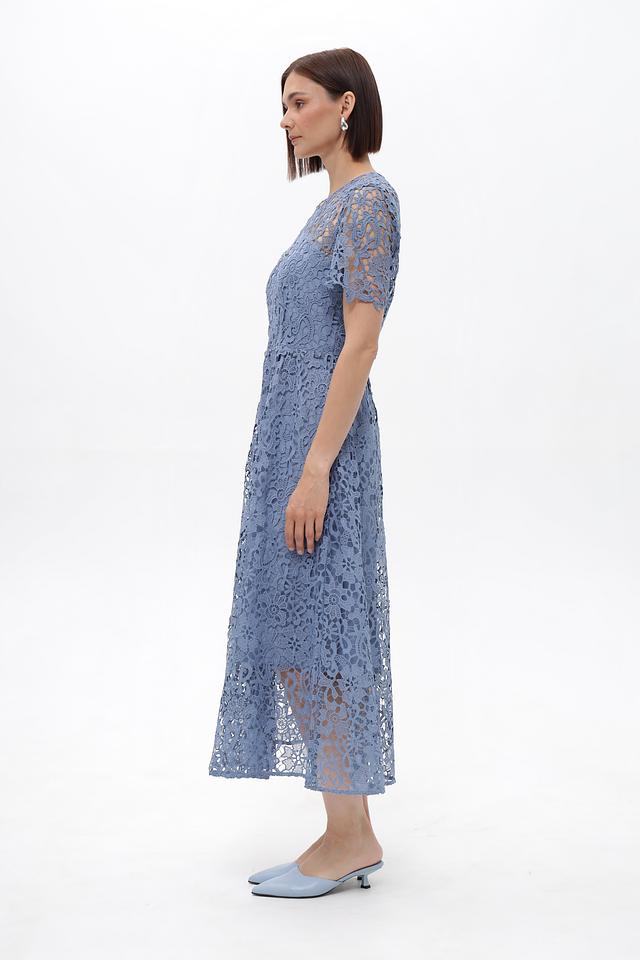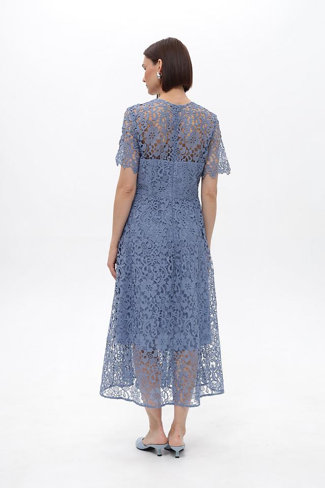 Платье имеет длину миди, короткие рукава и округлый вырез горловины. Кружевной узор покрывает всю поверхность изделия, создавая неповторимый и привлекательный вид. Силуэт платья слегка приталенный, подчеркивающий фигуру, но при этом не сковывающий движений.