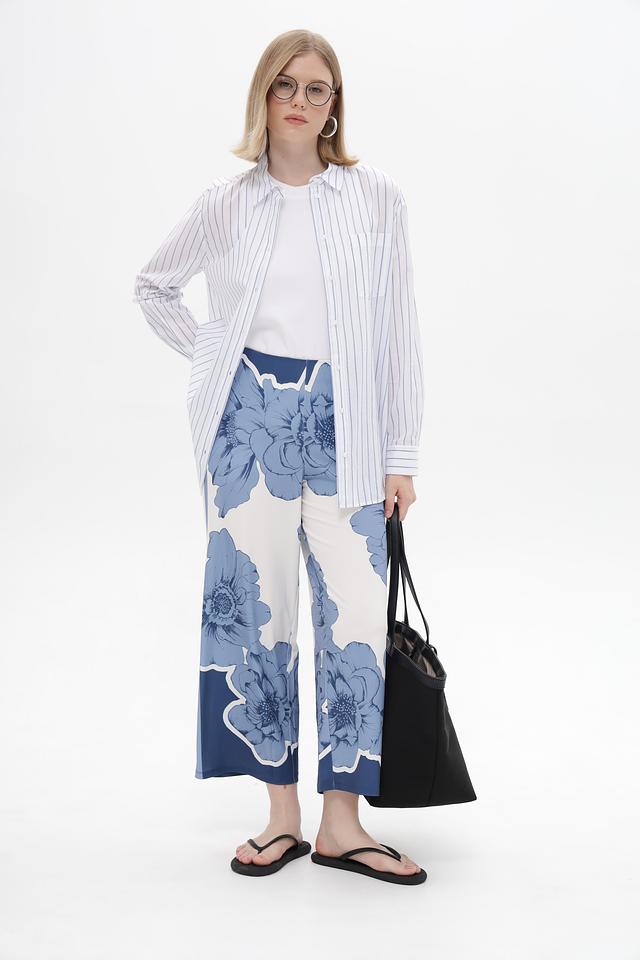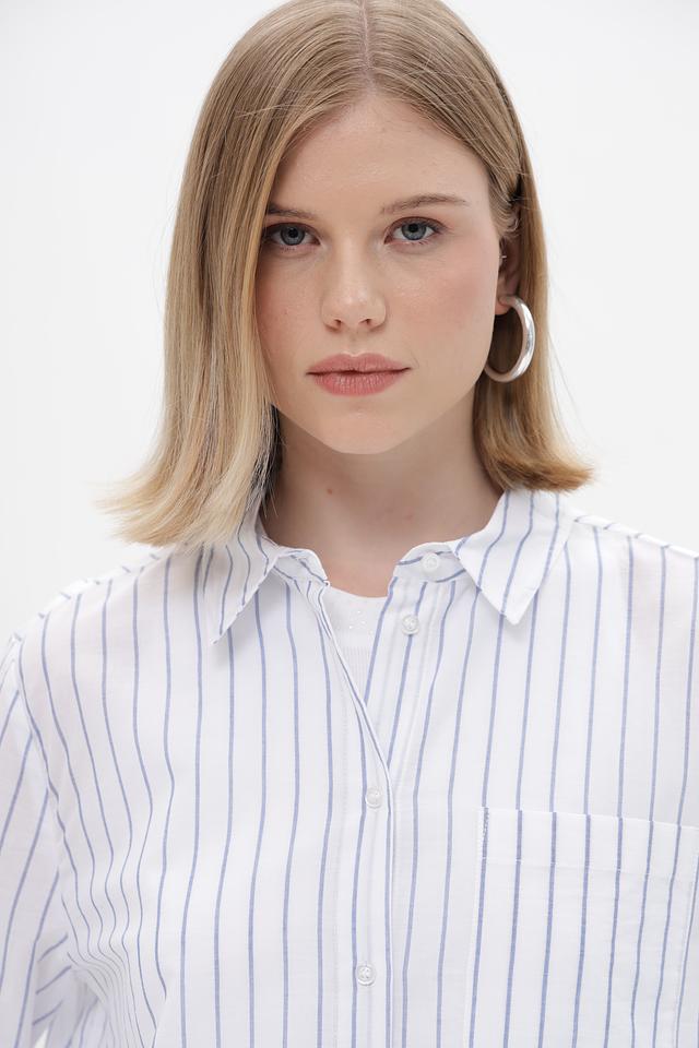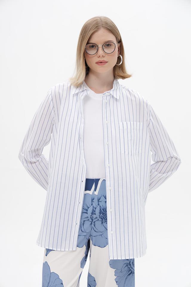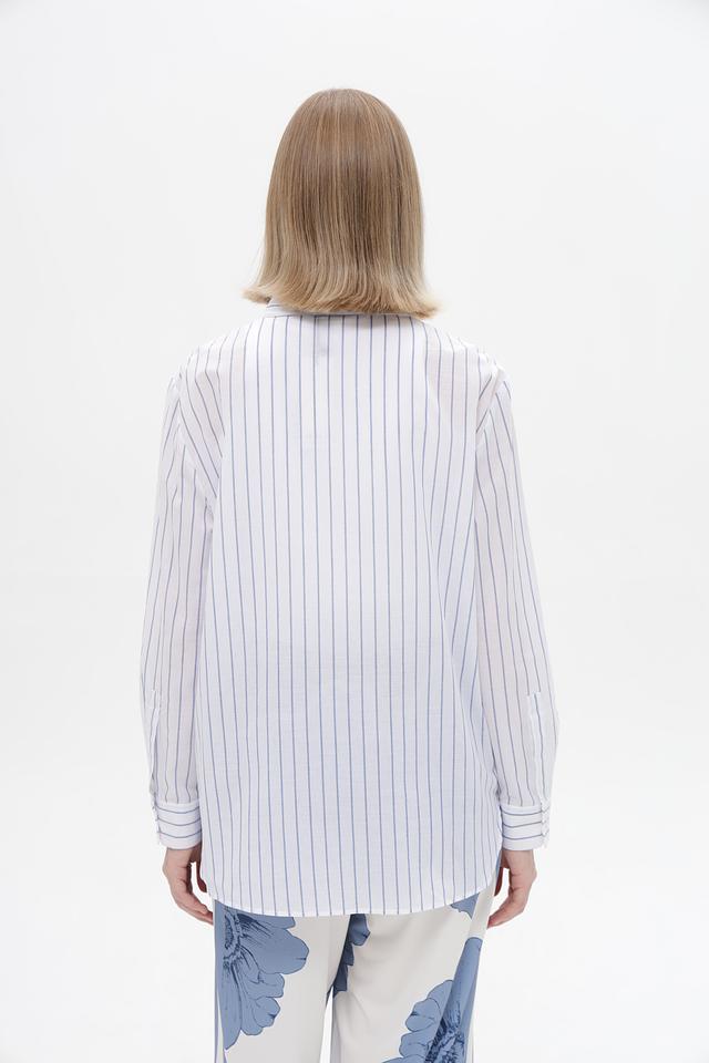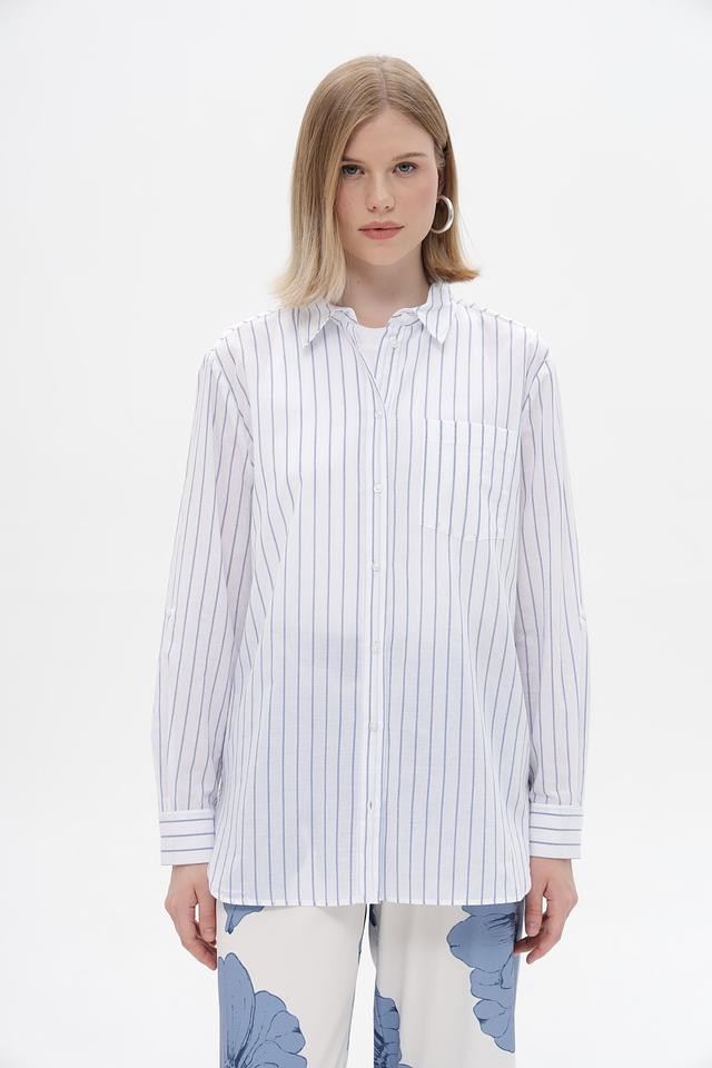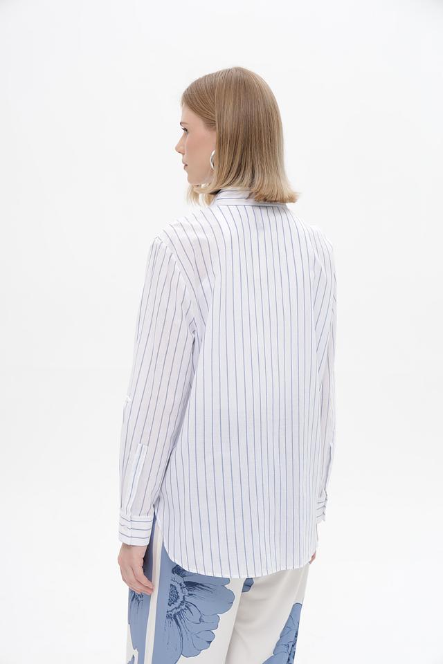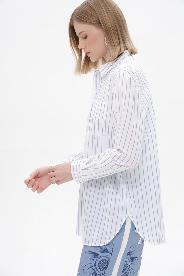 Белая блузка Oui с вертикальными голубыми полосками, выполнена из 100% хлопка. Классический крой и длинный рукав с манжетами. Идеально подходит для создания повседневных образов. Состав: хлопок 100%