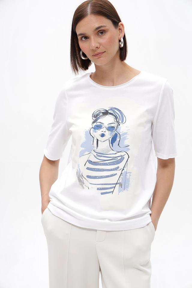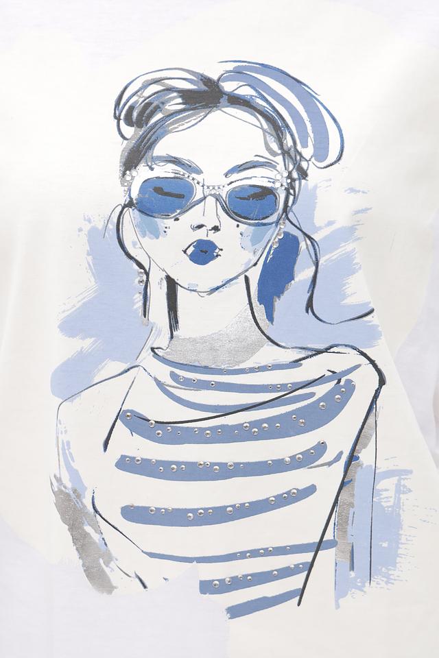 Особенностью данной модели является яркий и стильный принт с изображением девушки в берете и солнцезащитных очках, выполненный в голубых тонах. Этот принт добавляет футболке оригинальности и индивидуальности.