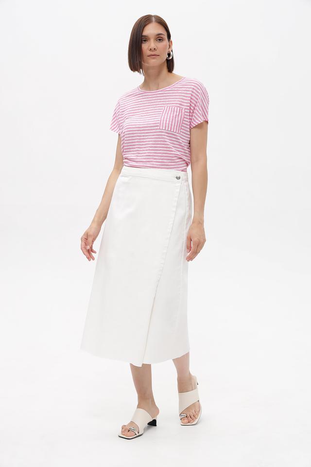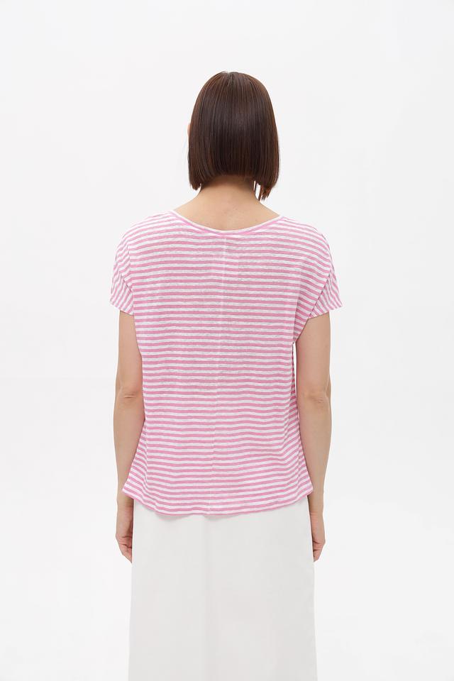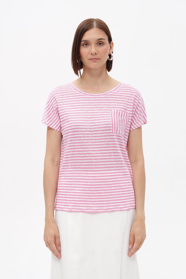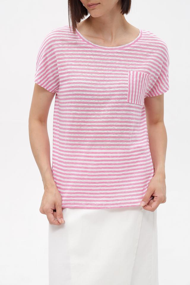Женская футболка Oui нежно-розового цвета в полоску с короткими рукавами и накладным карманом. Изготовлена из 100% льна, обеспечивающего комфорт и воздухопроницаемость в жаркую погоду. Состав: лен 100%