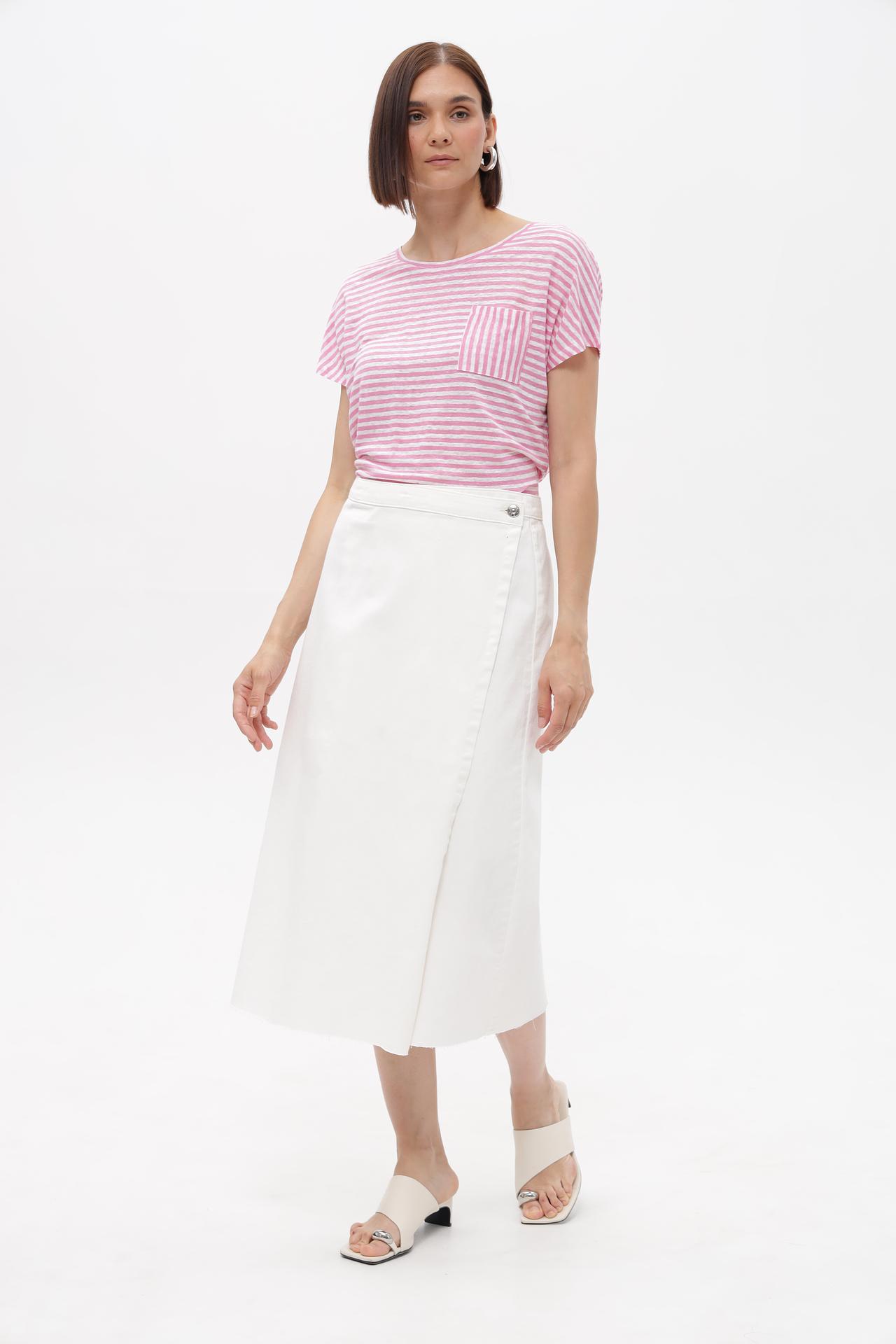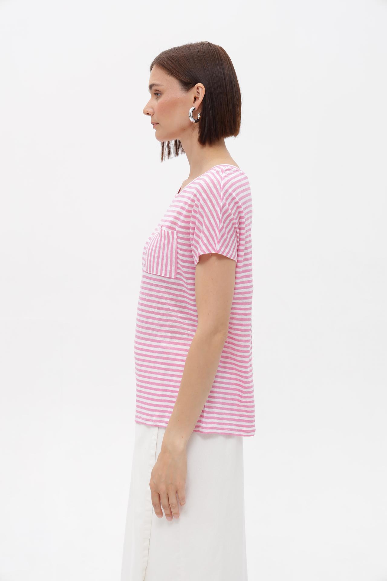 Эта стильная футболка станет прекрасным дополнением к вашему повседневному образу. Сочетайте ее с джинсами, шортами или юбкой для создания разнообразных летних комплектов. Небольшой карман добавляет практичности и оригинальности.
