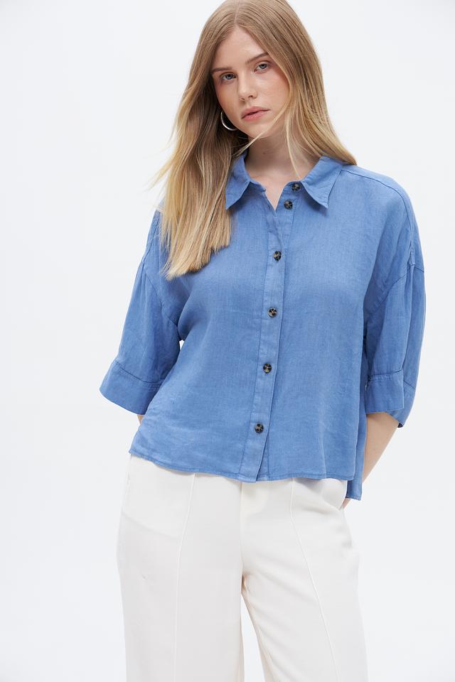 Голубая блуза от Oui из 100% льна – лёгкая и дышащая модель для комфортного образа. Обладает свободным кроем и рукавами 3/4. Состав: лен 100%