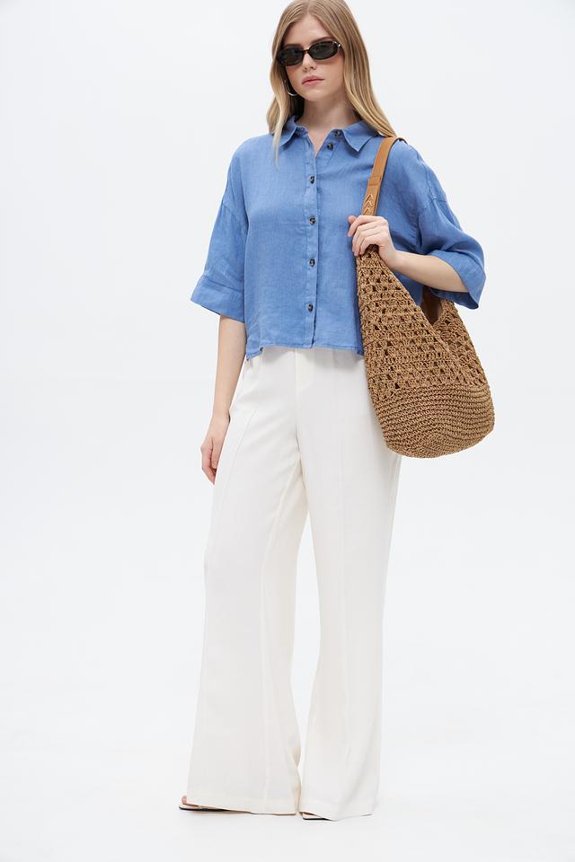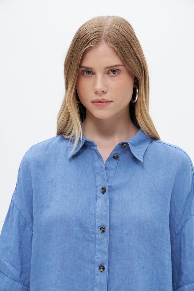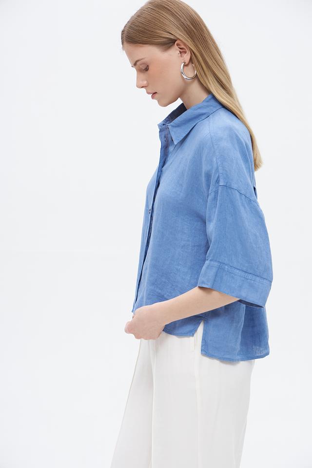 Блуза выполнена в нежном голубом цвете, который легко сочетается с различными элементами гардероба. Она имеет классический отложной воротник и застегивается на пуговицы по всей длине. Рукава блузы – три четверти, что делает её универсальной для разных сезонов.
