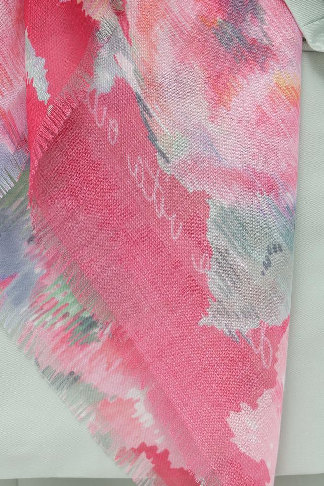 Дизайн шарфа представлен абстрактным цветочным принтом, сочетающим в себе оттенки розового, красного, голубого и зеленого. Такое сочетание цветов делает этот аксессуар универсальным и подходящим для различных стилей одежды.