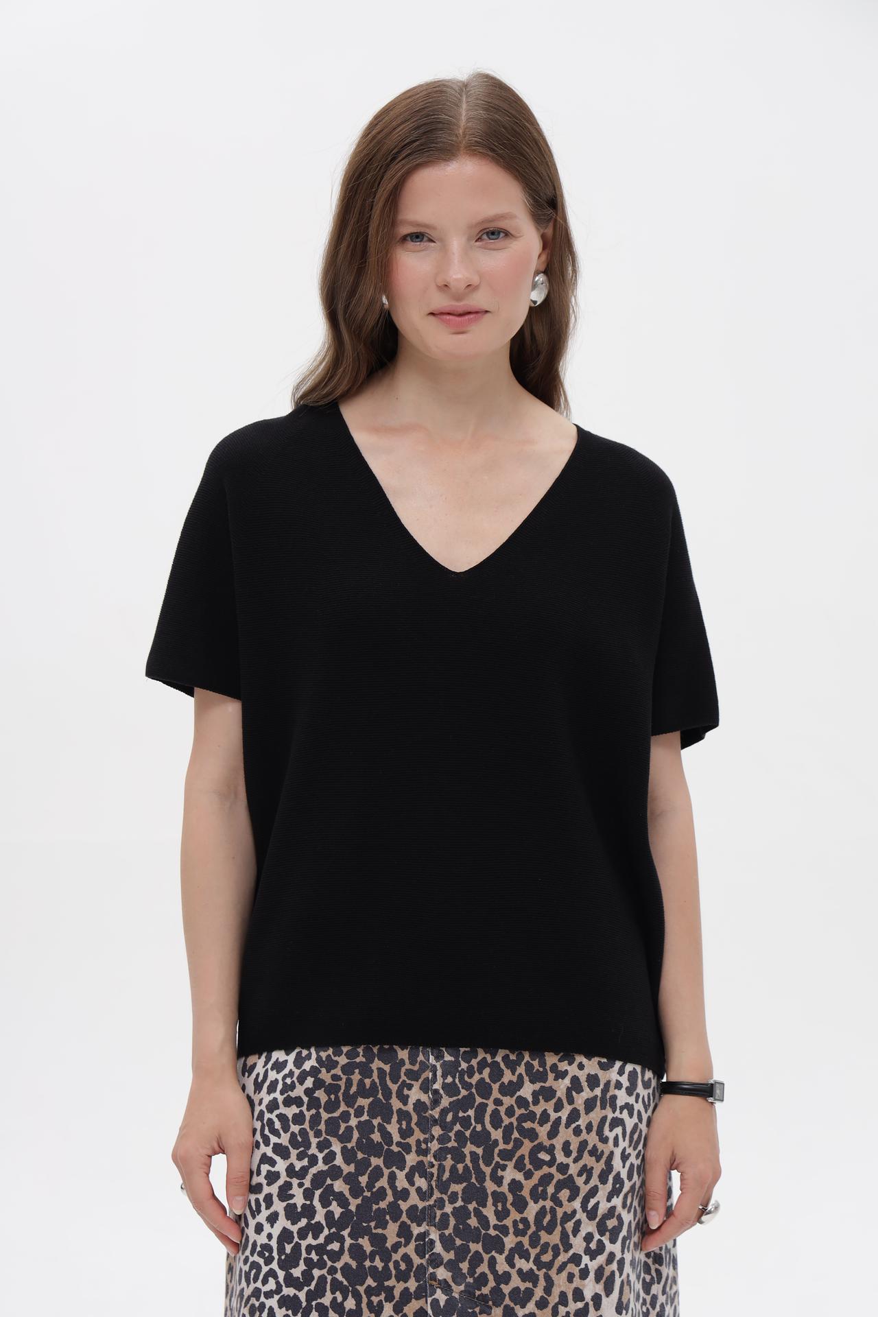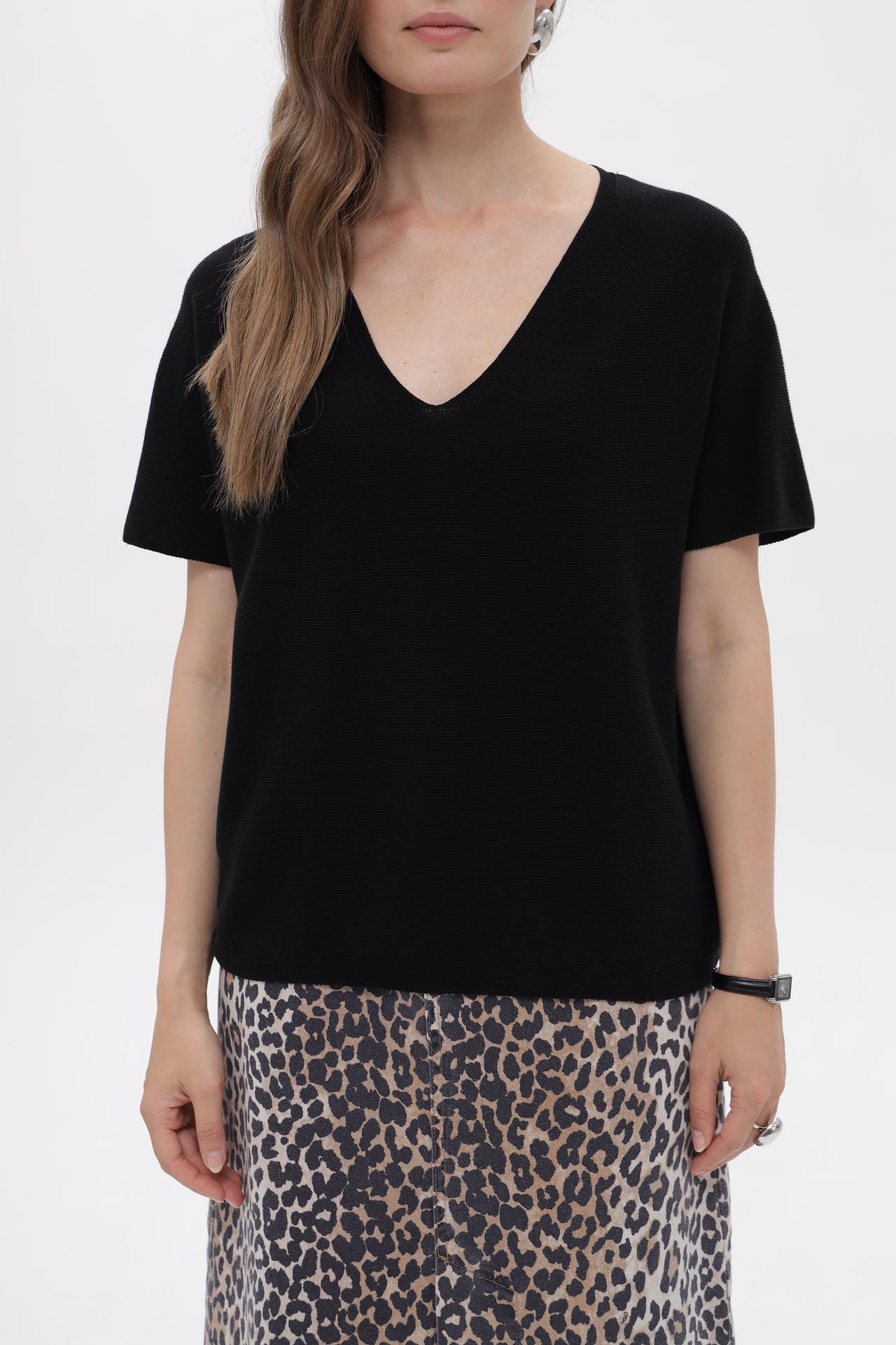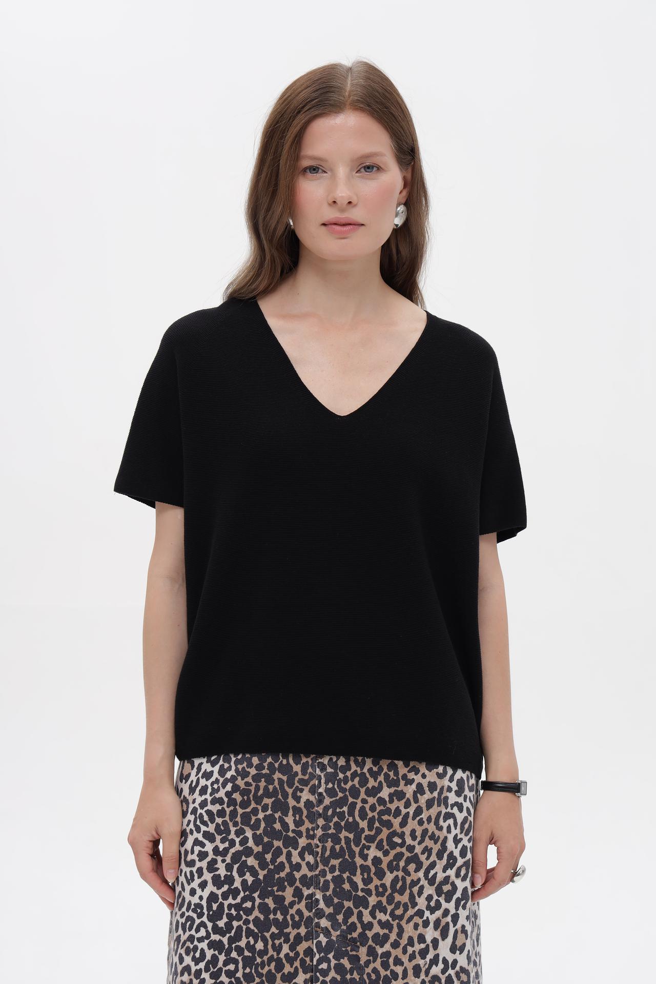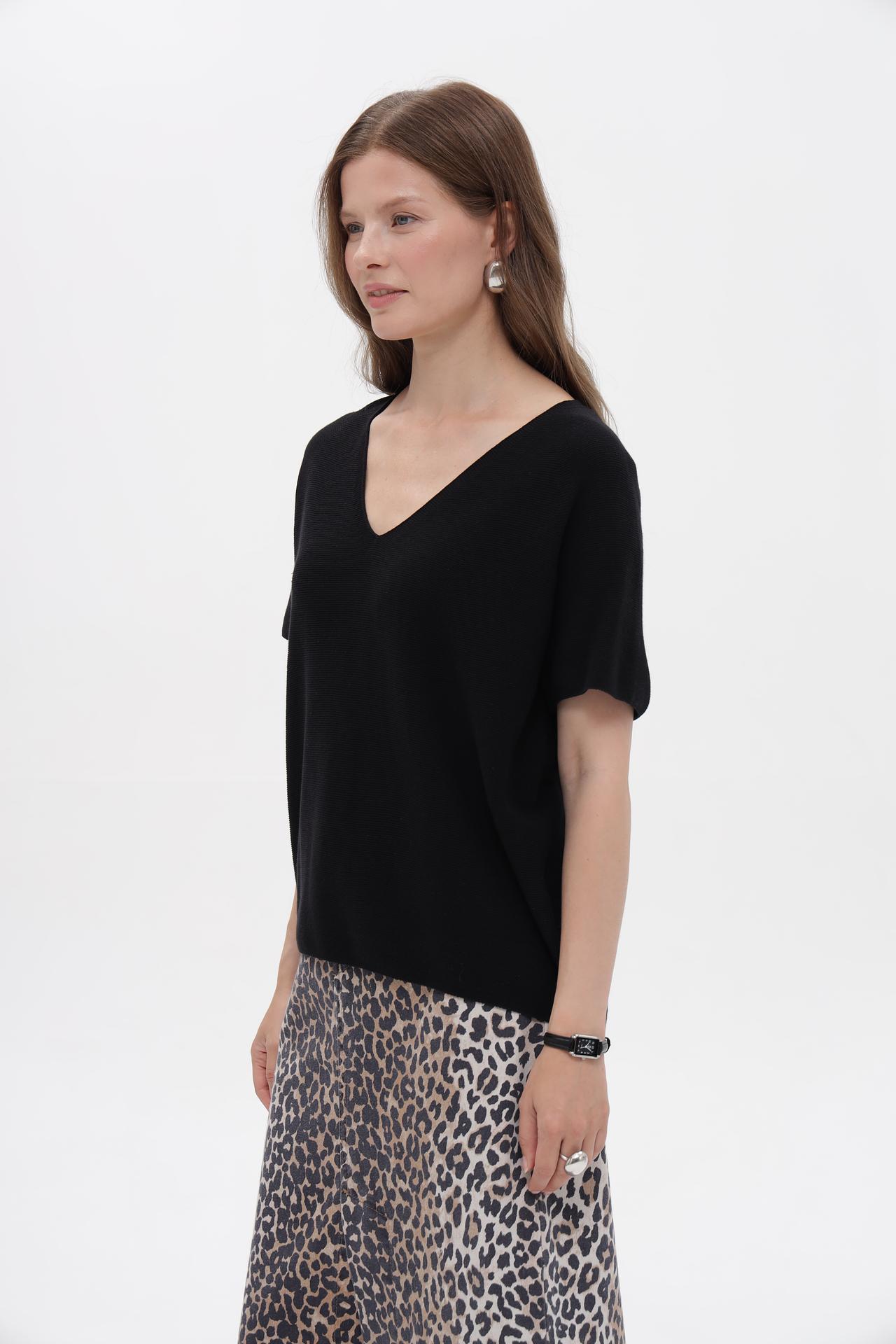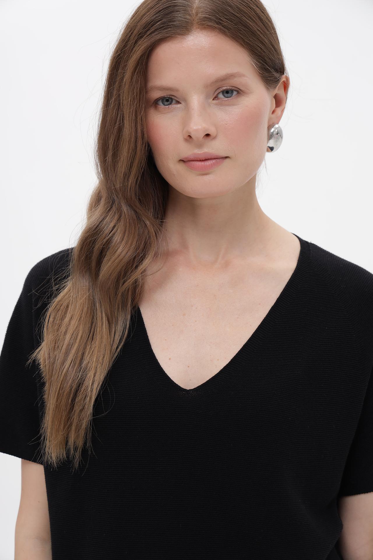 - Дизайн: V-образный вырез горловины. Такой вырез визуально удлиняет шею и подходит практически любому типу фигуры, придавая образу изящество.