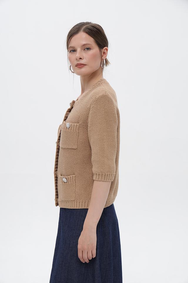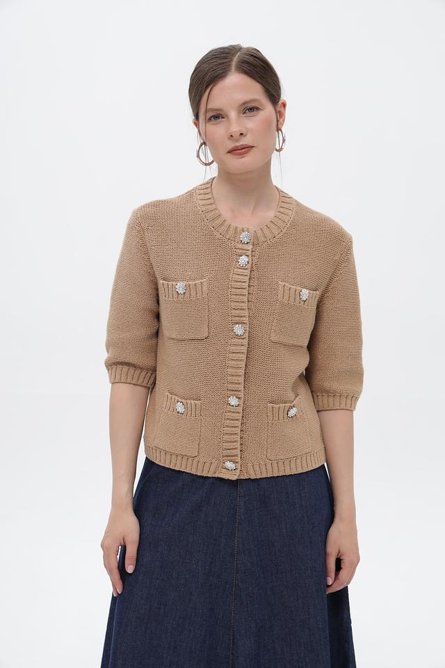 Жакет застегивается на ряд декоративных пуговиц, украшенных стразами, что придает изделию элегантный и изысканный вид. Два накладных кармана добавляют практичности и завершают дизайн.