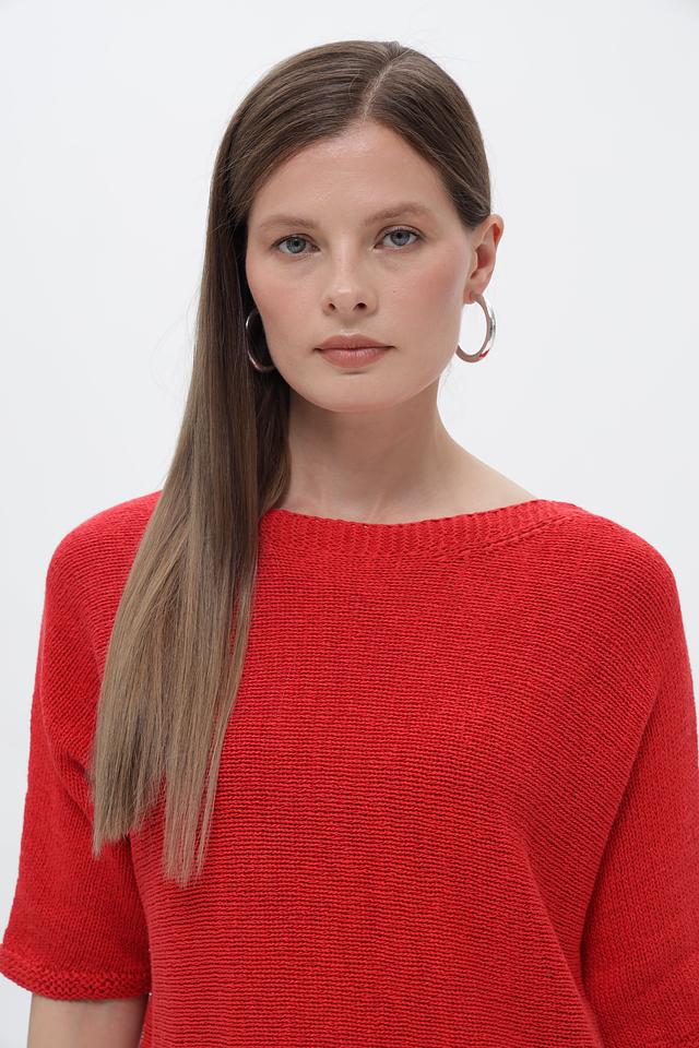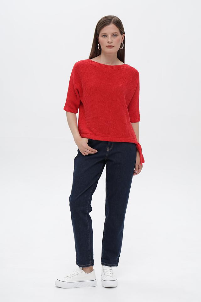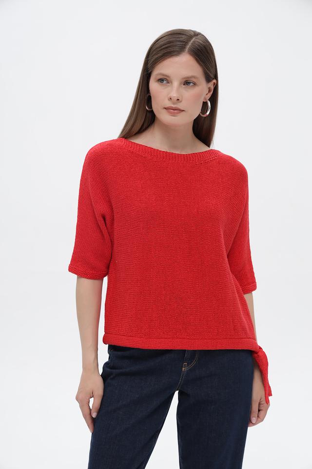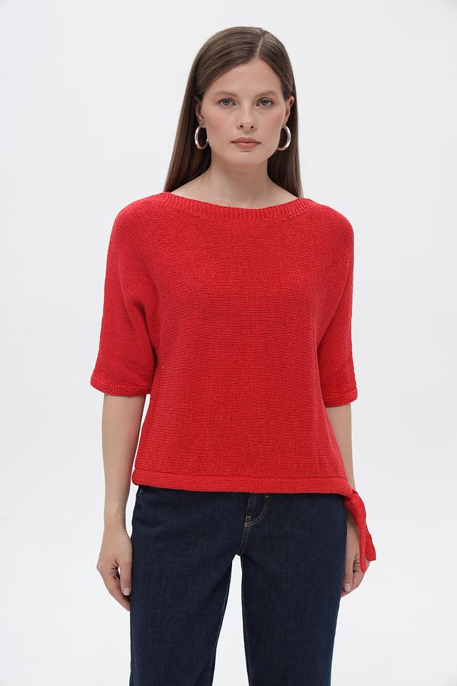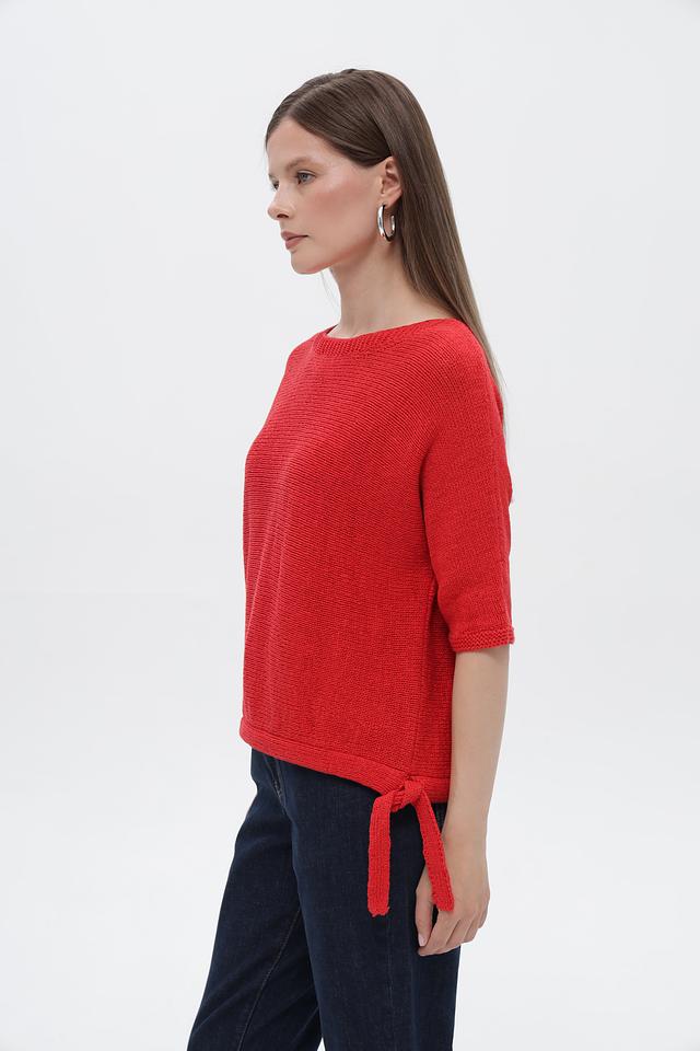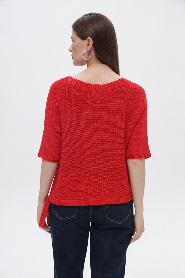 Пуловер имеет яркий красный цвет и свободный крой, который не сковывает движения. Короткие рукава делают его идеальным выбором для теплой погоды. Оригинальным элементом дизайна являются завязки по бокам, которые позволяют регулировать силуэт и создавать различные образы.