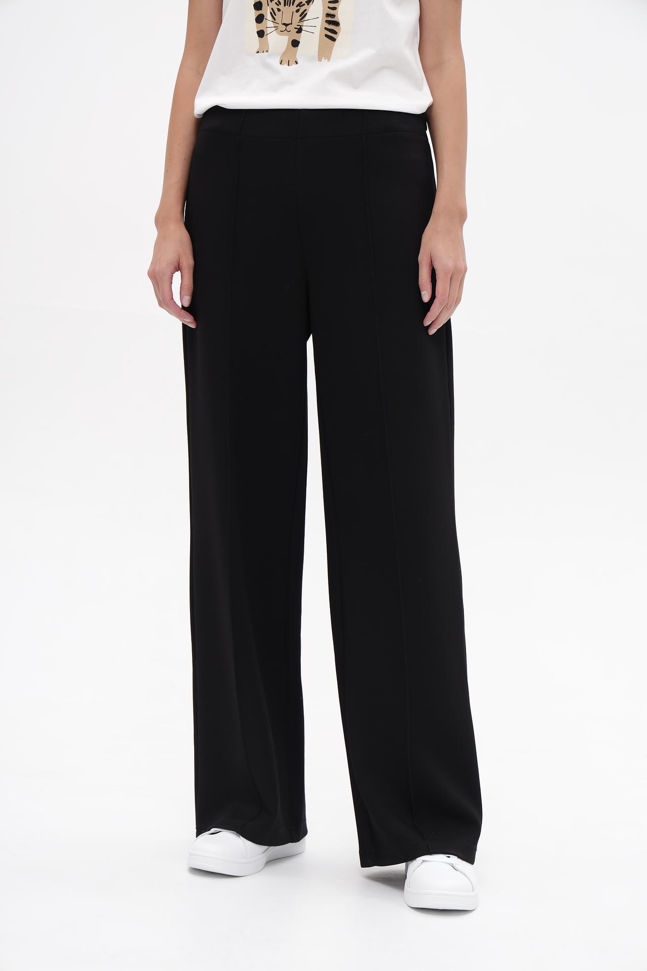 - Современный крой: Широкие брюки палаццо со средней посадкой и стрелками визуально удлиняют ноги и придают образу утонченность. Такой фасон актуален и всегда выглядит модно.