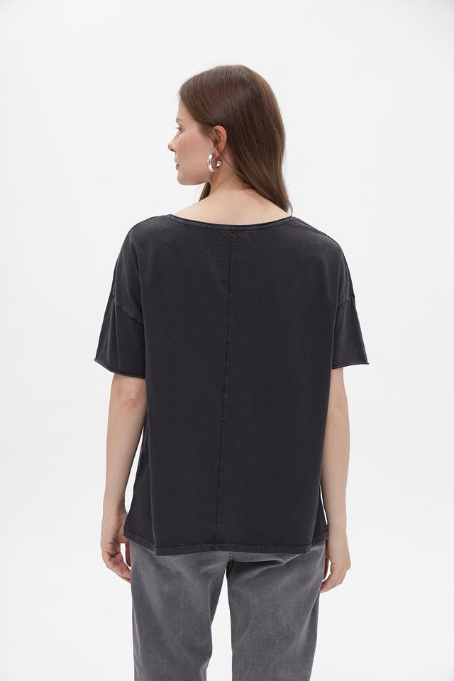 Женская футболка от бренда Oui выполнена в графитовом цвете. Модель имеет прямой, слегка заниженный крой, что обеспечивает свободу движений и расслабленный образ.