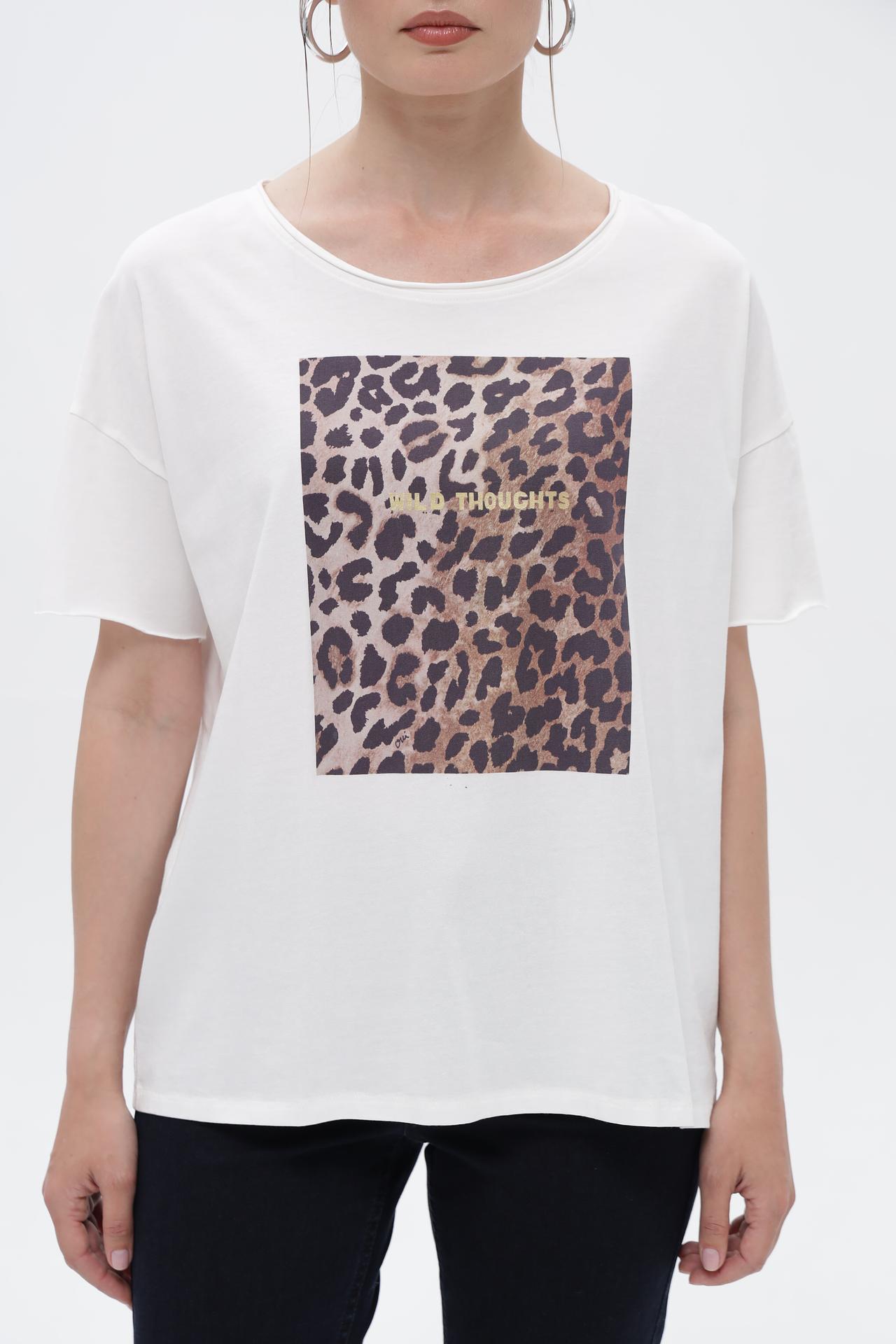 - Актуальный принт: Стильный леопардовый принт с золотистой надписью в центре внимания добавляет образу характера и индивидуальности. Этот элемент делает базовую вещь выразительной и запоминающейся.