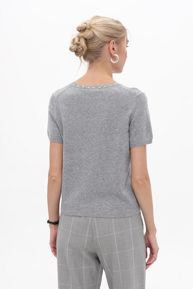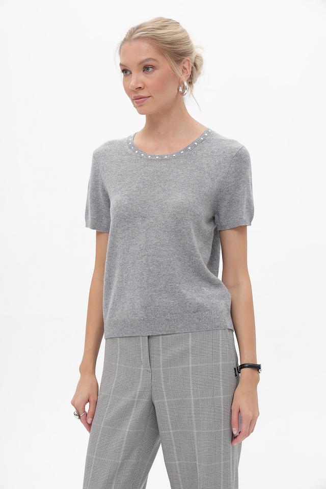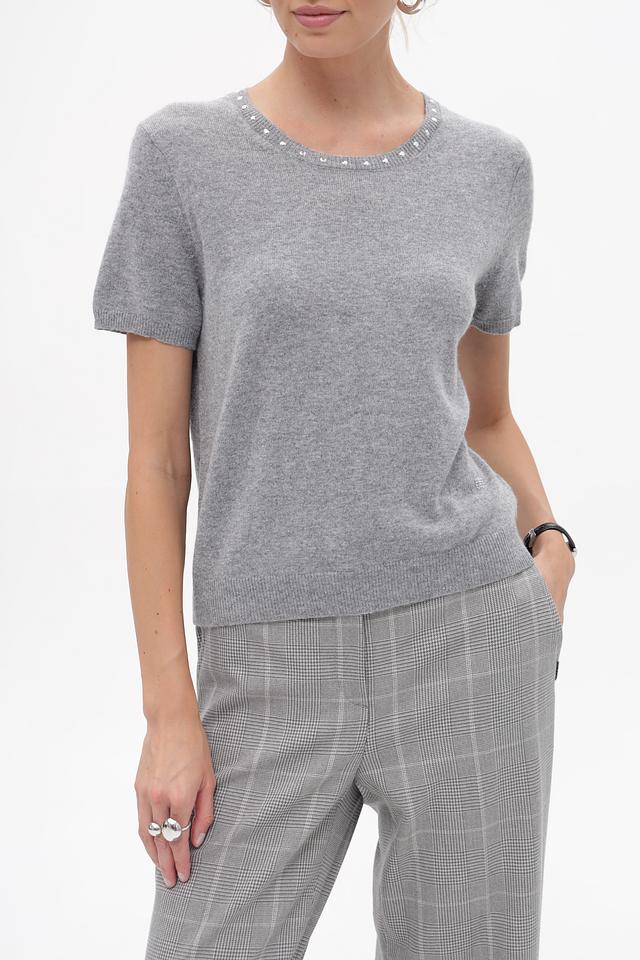 Серый пуловер от Oui с коротким рукавом и деликатной отделкой из жемчуга. Изготовлен из мягкой смеси натуральных и синтетических волокон, обеспечивающей комфорт и удобство в носке. Состав: полиамид 45%, вискоза 30%, шерсть 20%, кашемир 5%