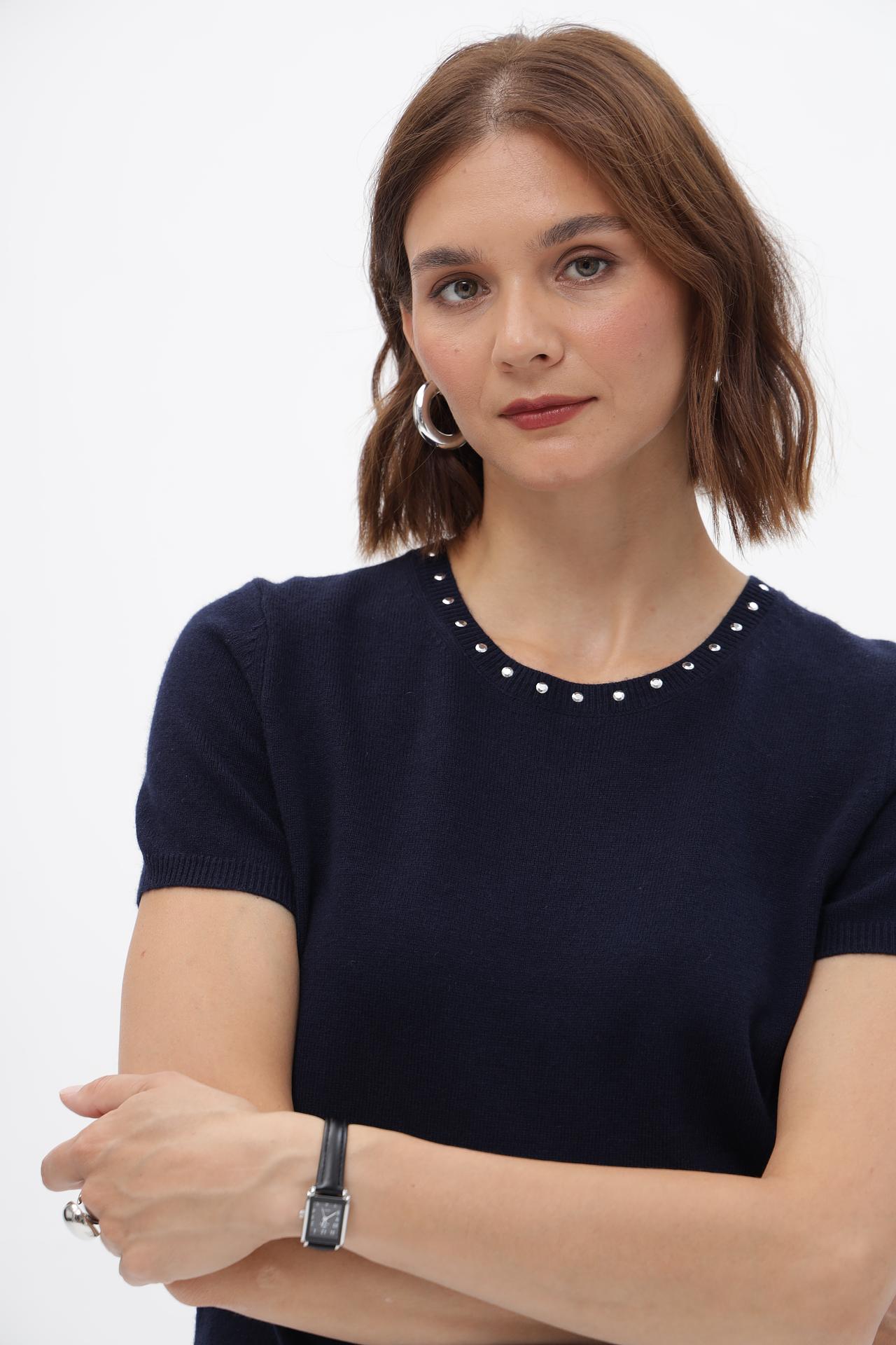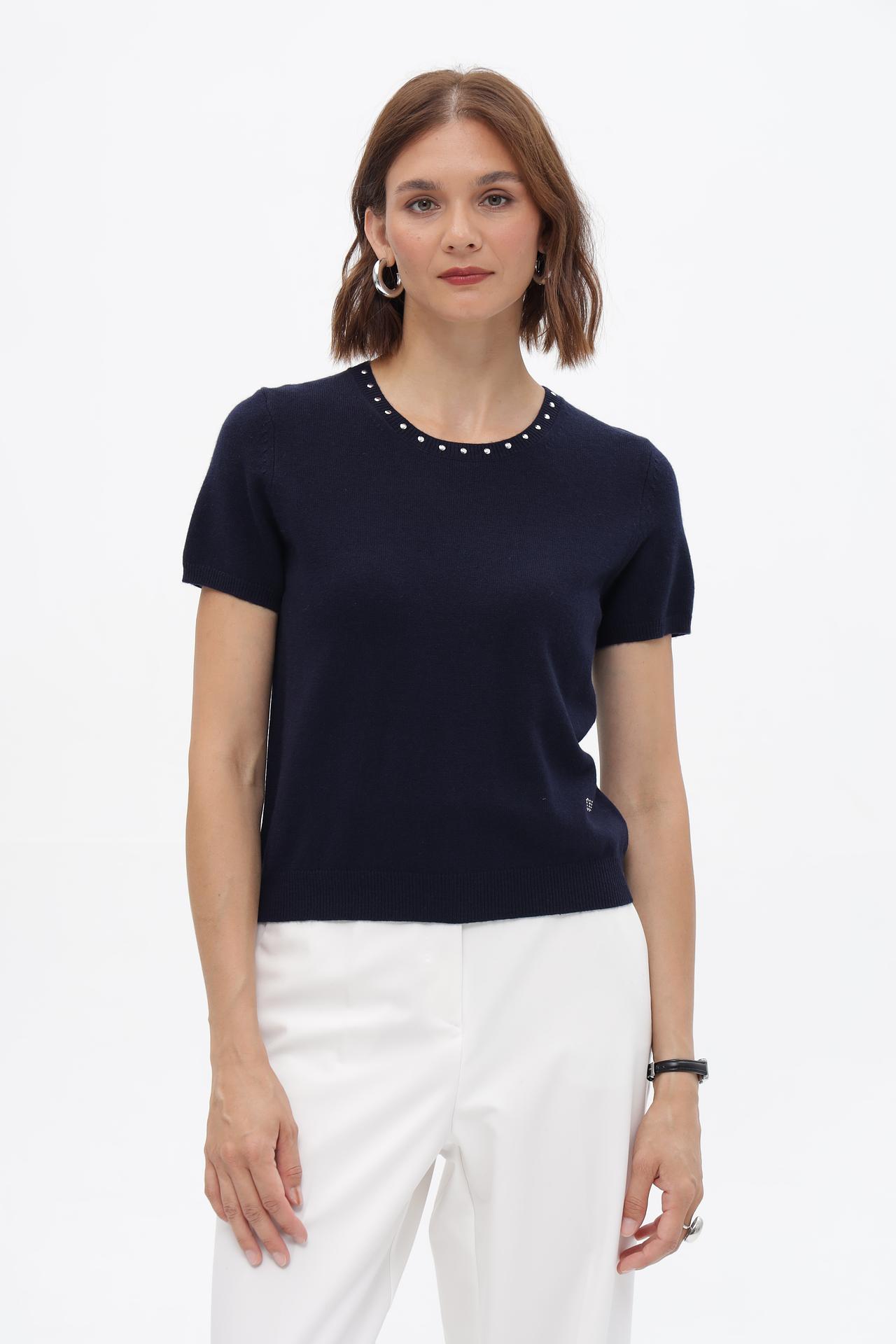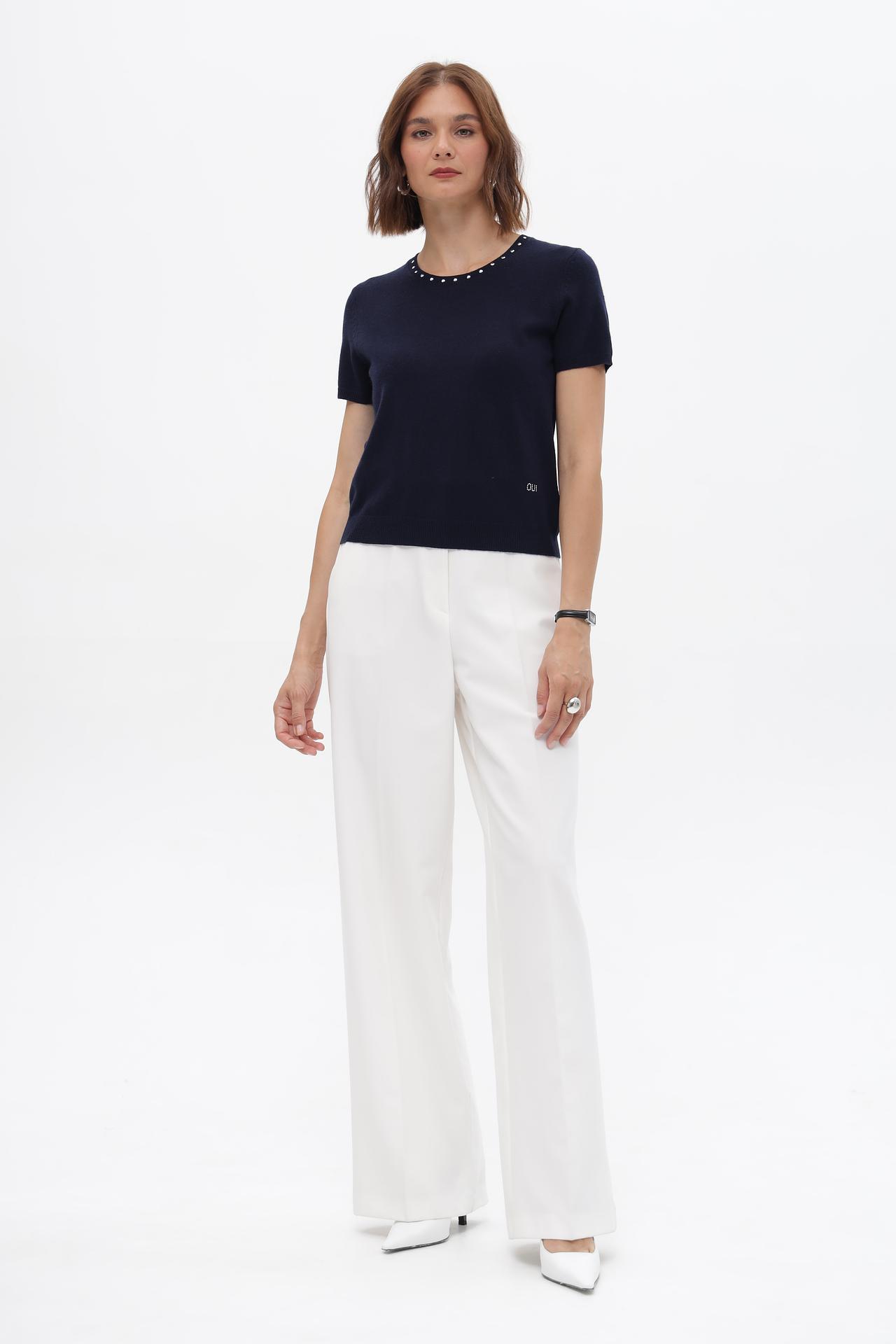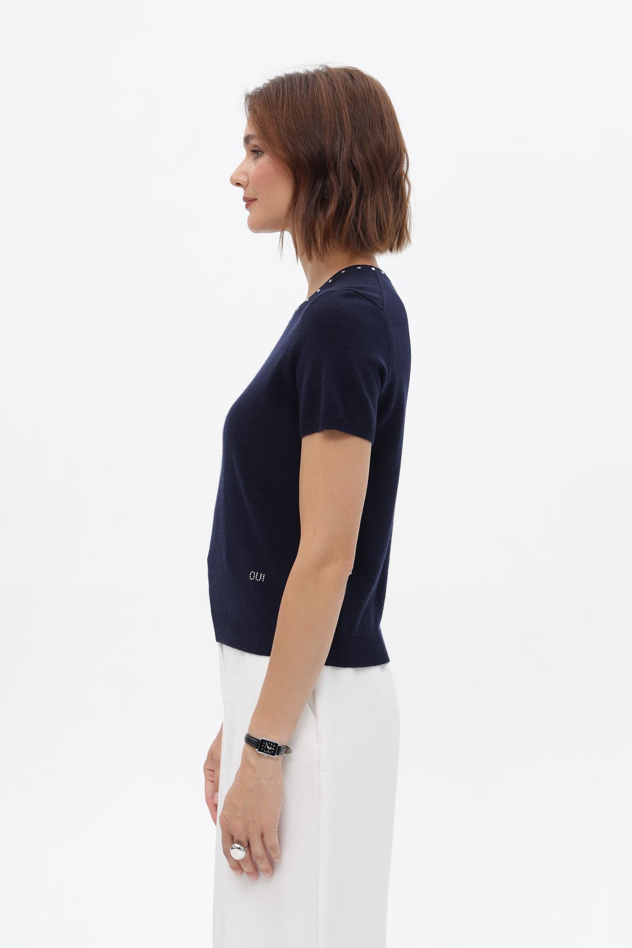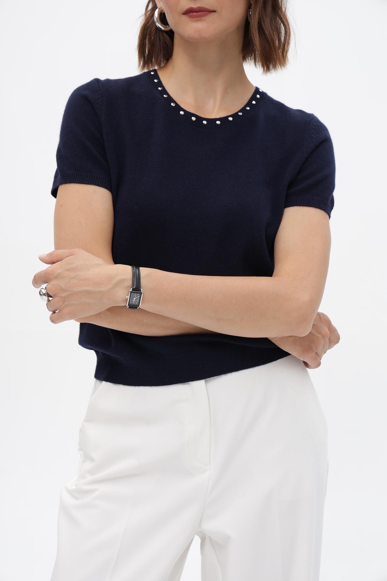 Элегантный темно-синий пуловер от Oui — идеальное дополнение к вашему базовому гардеробу. Модель с коротким рукавом и круглым вырезом горловины, украшенным деликатными бусинами, добавит изысканности любому образу. Приятная на ощупь ткань обеспечивает комфорт в течение всего дня, а классический крой позволяет легко сочетать пуловер с различными элементами одежды, от строгих брюк до джинсов.