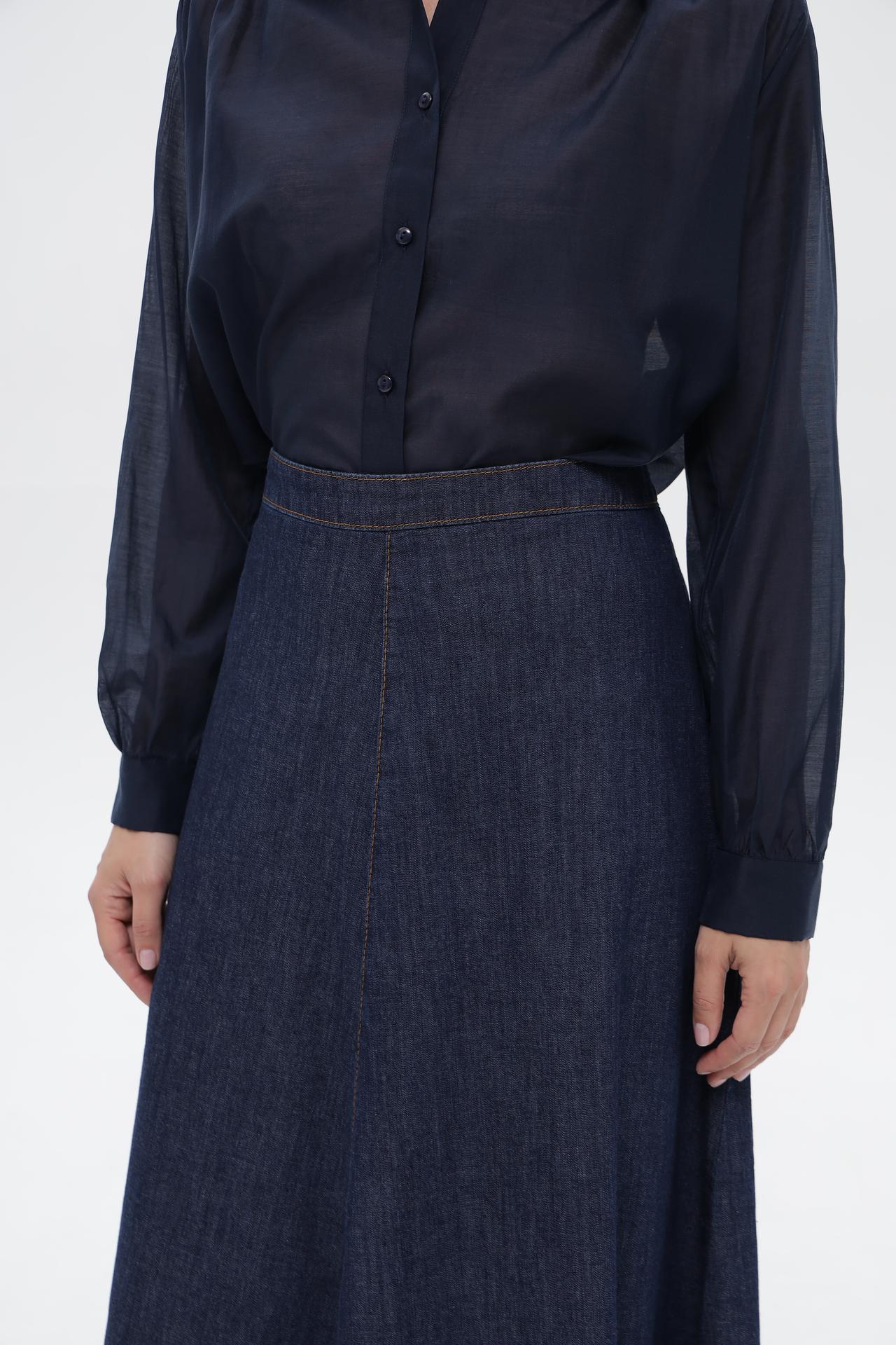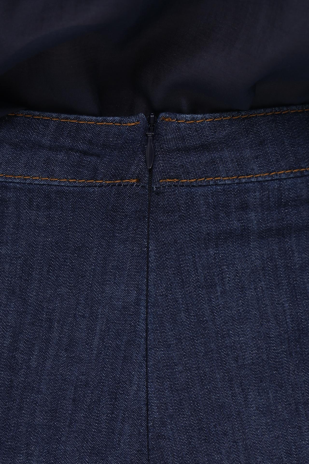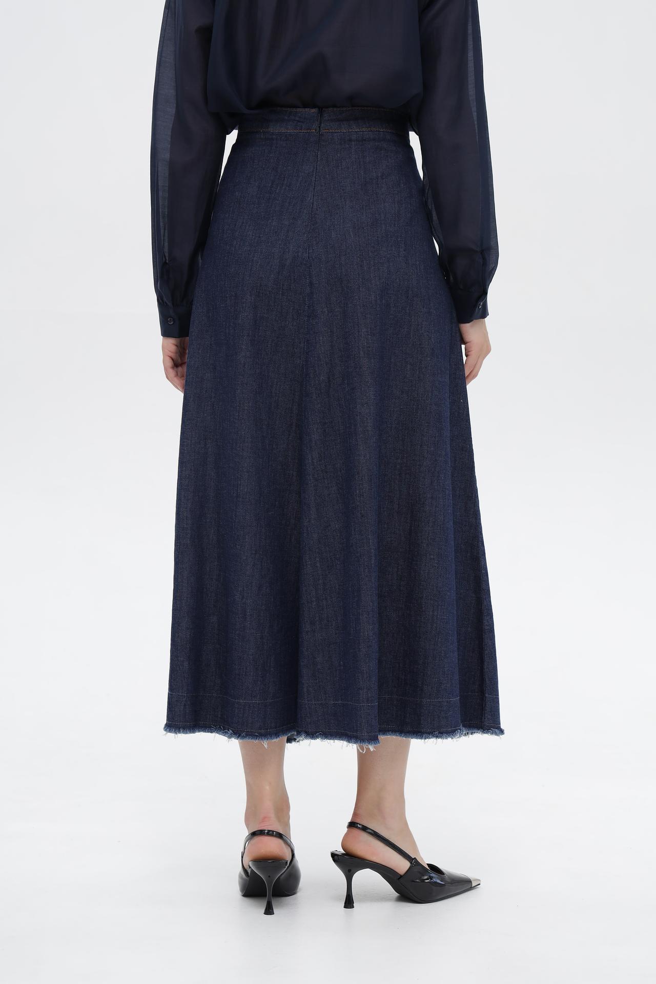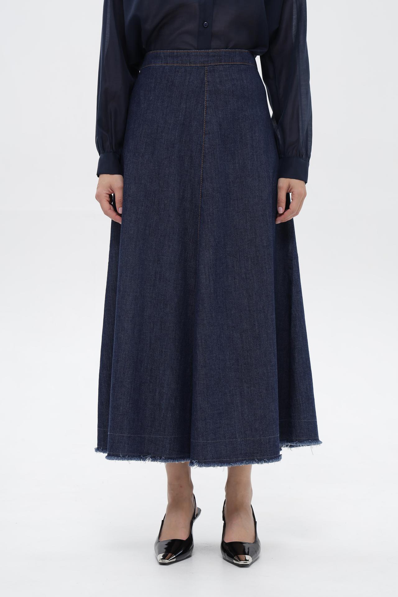 - Детали: Контрастная отстрочка подчеркивает линии кроя. Необработанный край с бахромой придает юбке модный и слегка небрежный вид.