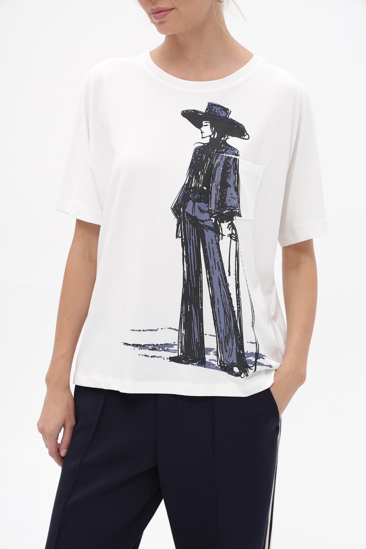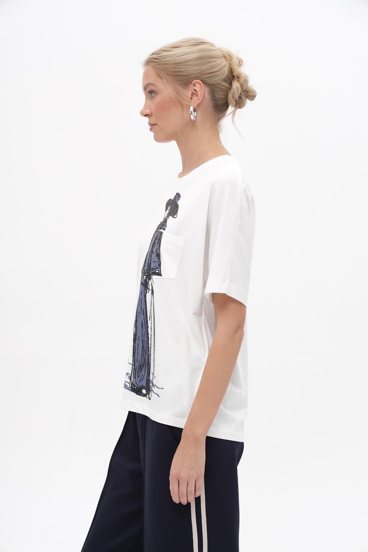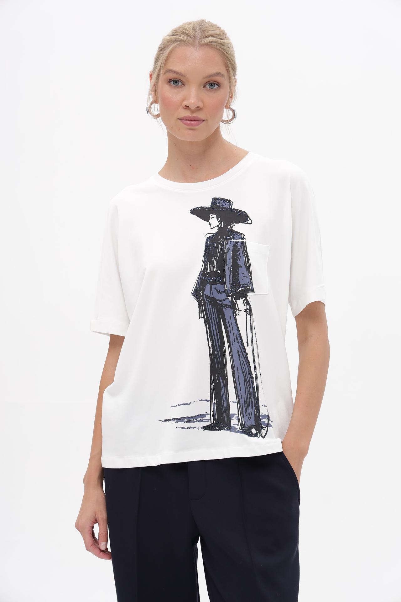 Футболка имеет прямой силуэт, классический круглый вырез и короткие рукава с аккуратными отворотами. Оригинальный графичный принт в виде женского силуэта и функциональный накладной карман на груди добавляют изделию изысканности и делают его акцентной деталью любого наряда.