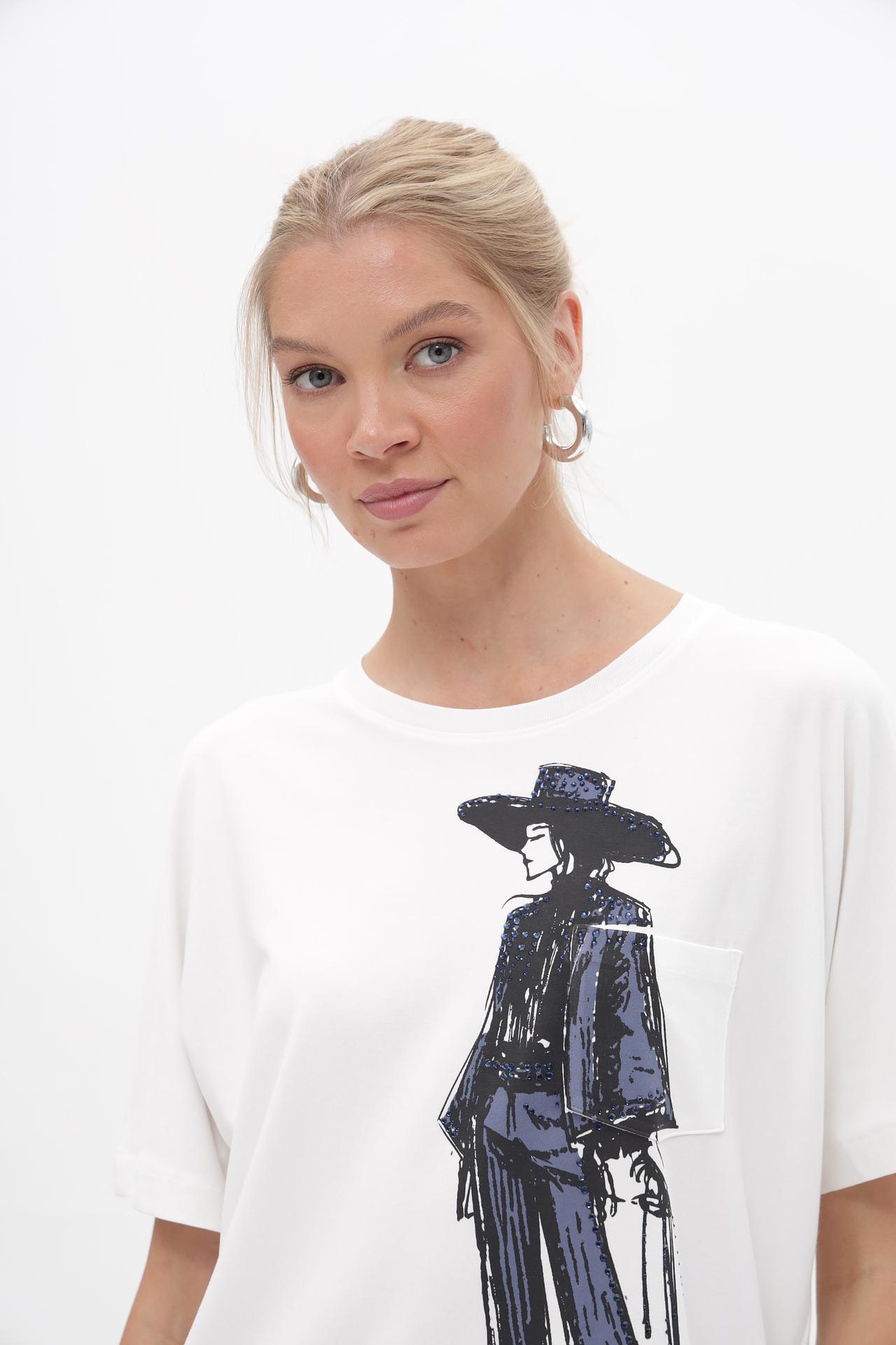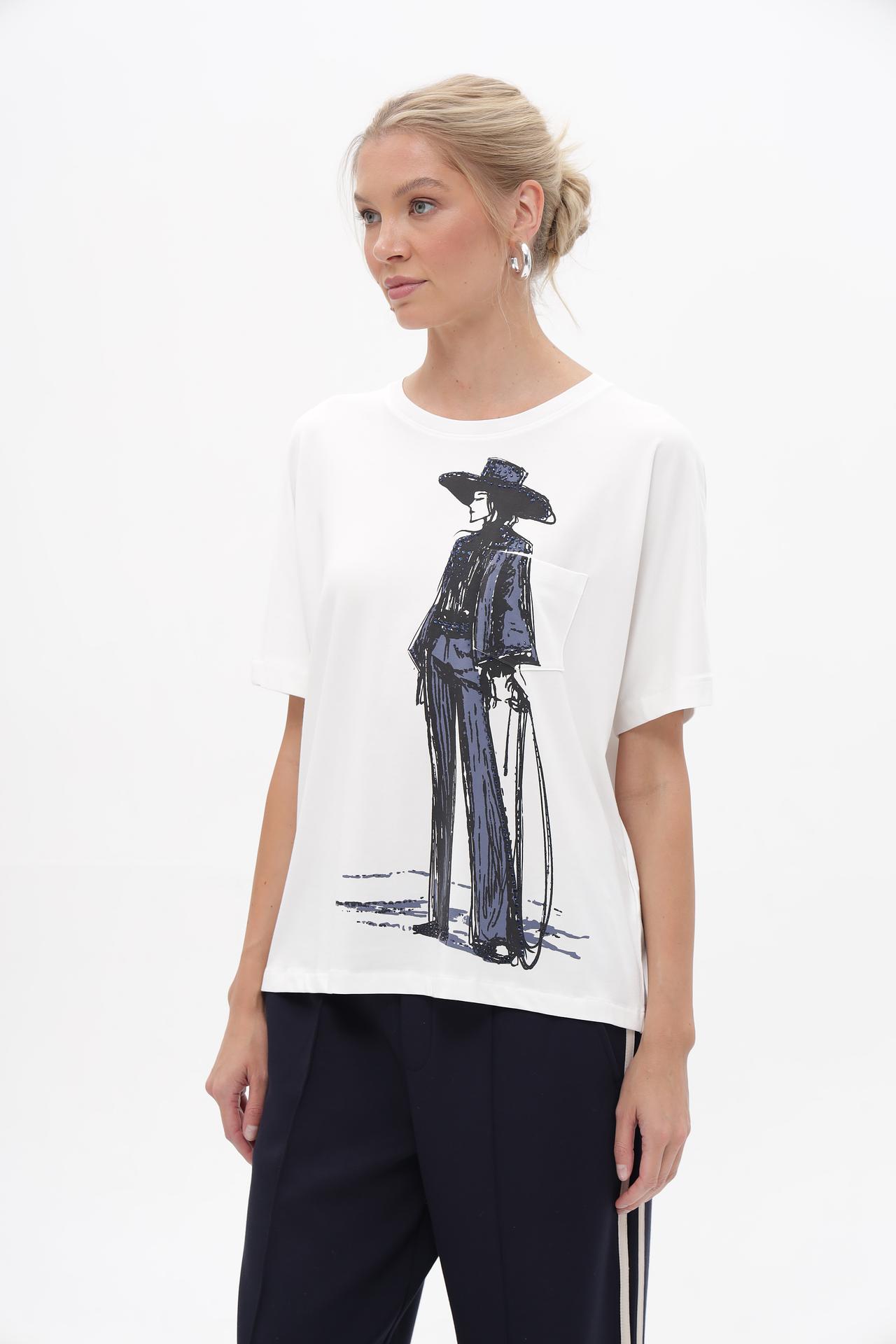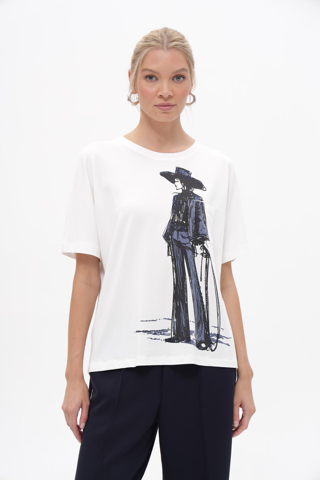 Футболка имеет прямой силуэт, классический круглый вырез и короткие рукава с аккуратными отворотами. Оригинальный графичный принт в виде женского силуэта и функциональный накладной карман на груди добавляют изделию изысканности и делают его акцентной деталью любого наряда.
