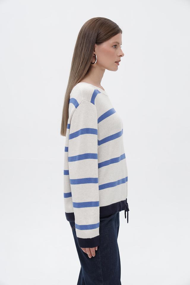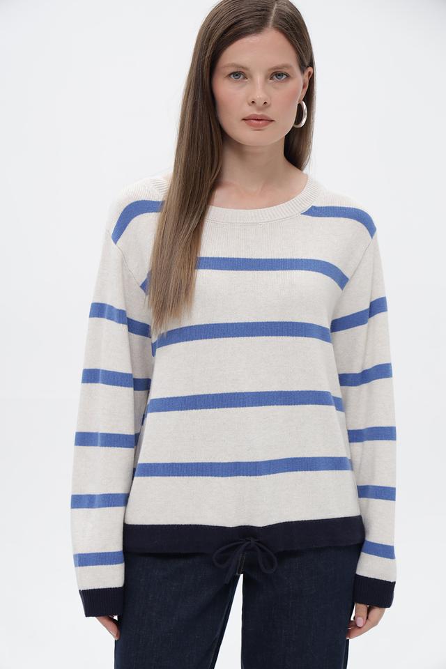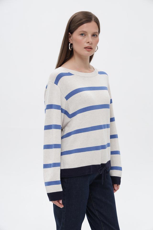 Женский пуловер от бренда Oui выполнен в бежевом цвете с горизонтальными полосами синего и тёмно-синего оттенков. Модель имеет круглый вырез горловины и длинные рукава.