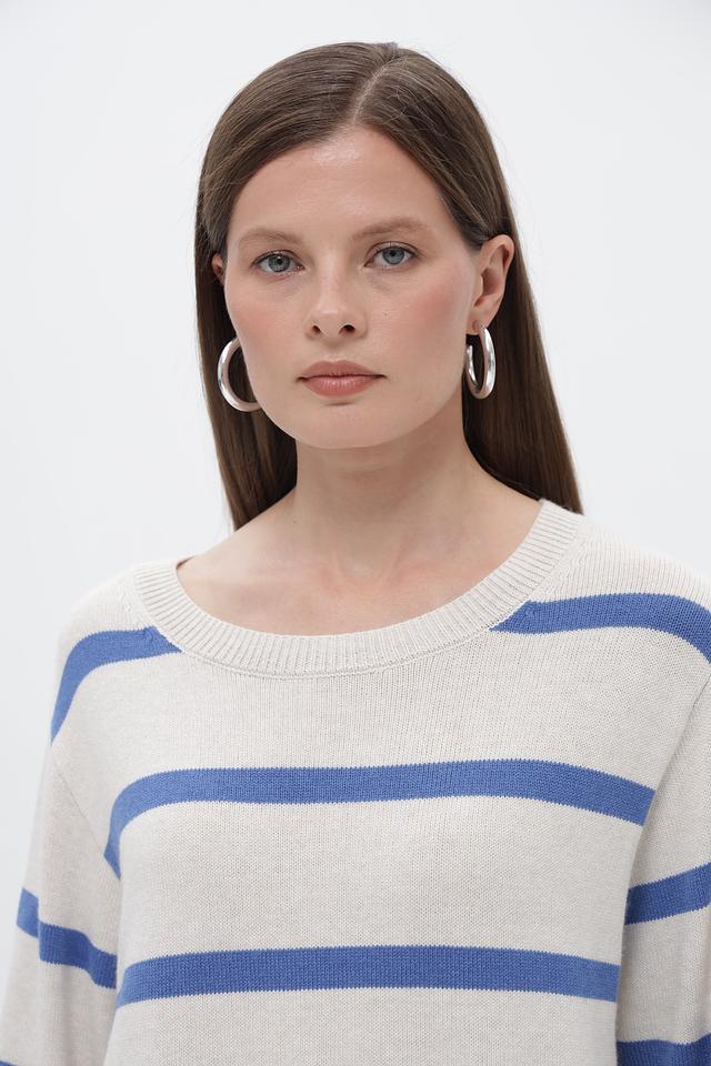 Бежевый пуловер от Oui с горизонтальными полосами синего и тёмно-синего цветов. Изготовлен из мягкого трикотажа с добавлением хлопка, вискозы и полиамида. Состав: полиамид 43%, хлопок 30%, вискоза 27%
