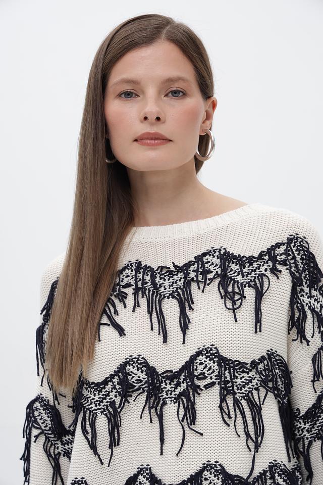 Особенности дизайна: пуловер украшен эффектным принтом, изображающим лошадей, выполненным в чёрном цвете. Дополнительным декоративным элементом служит бахрома, расположенная по контуру рисунка, придающая изделию оригинальность.