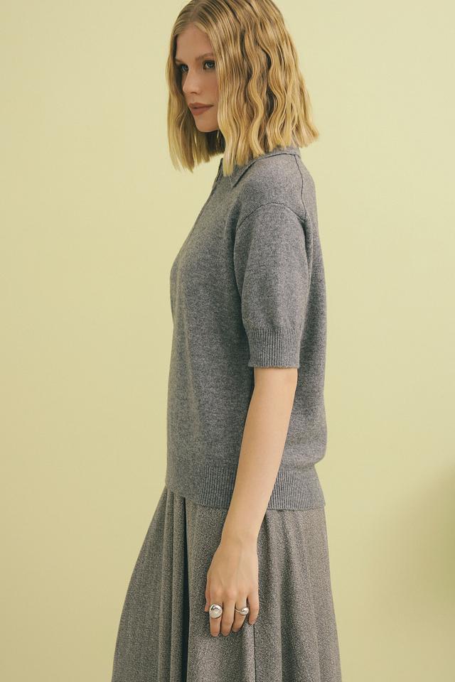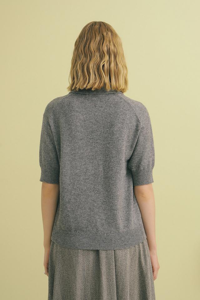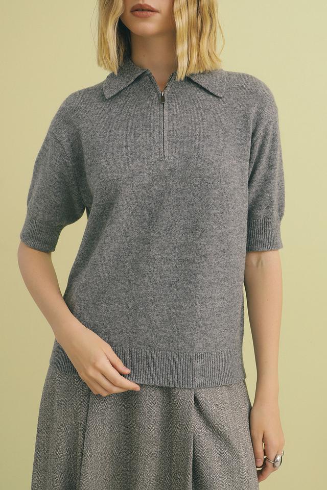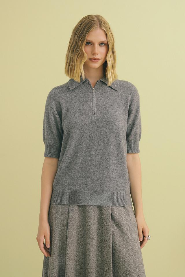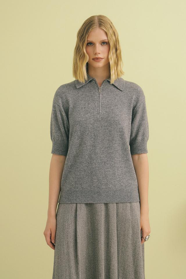 Пуловер имеет короткий рукав и воротник-поло с застежкой-молнией, что позволяет регулировать глубину выреза.