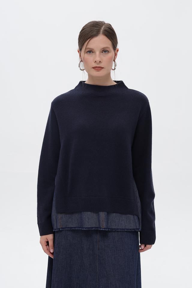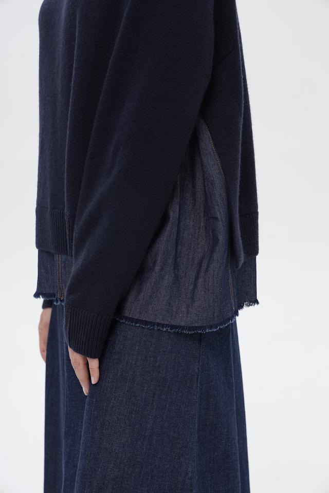 Пуловер имеет воротник-стойку, придающий образу элегантность. Длинные рукавы с манжетами дополняют силуэт. Джинсовая вставка выполнена из качественного денима с необработанными краями, создавая эффект лёгкой небрежности.