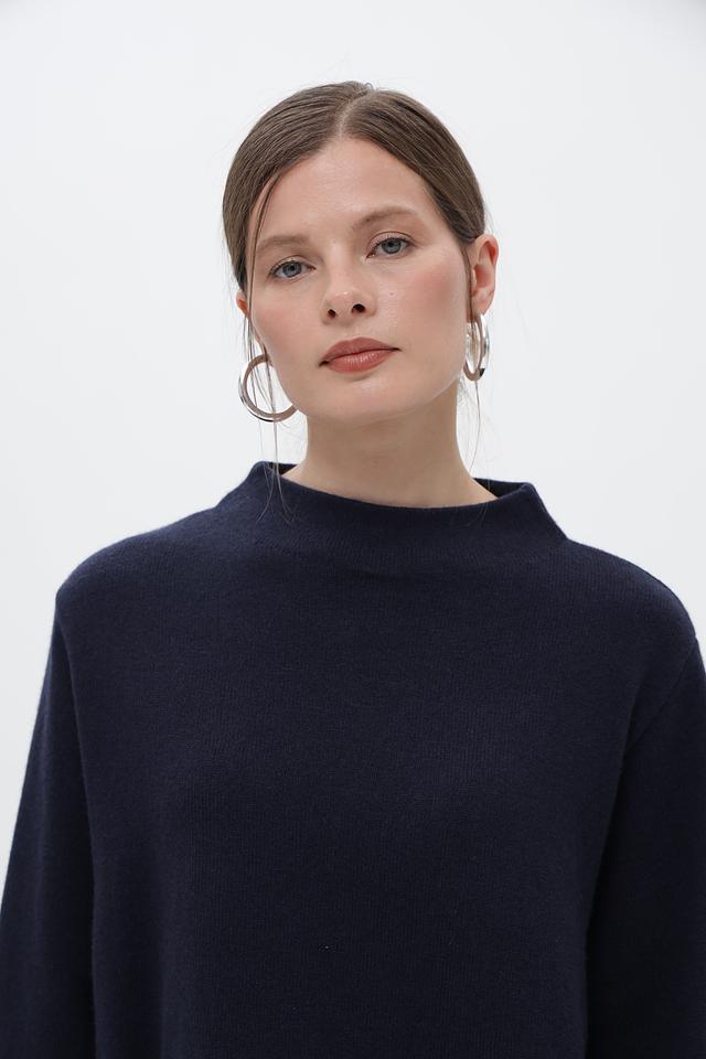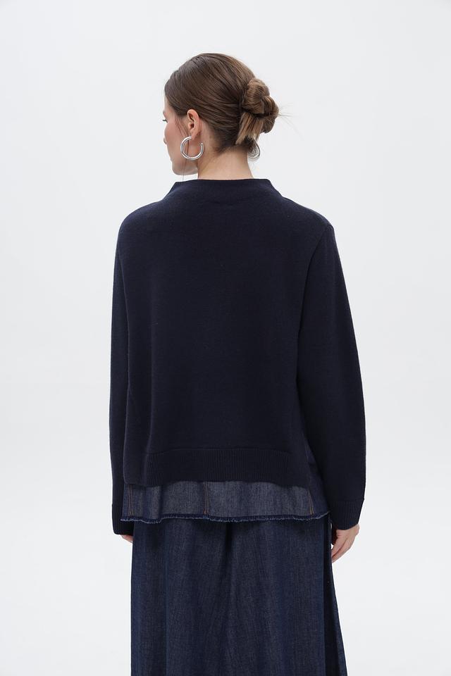 Пуловер Oui тёмно-синего цвета с оригинальной джинсовой вставкой. Изготовлен из мягкой шерсти с добавлением полиамида и хлопка для комфорта и износостойкости. Состав: шерсть 55%, полиамид 25%, хлопок 20%