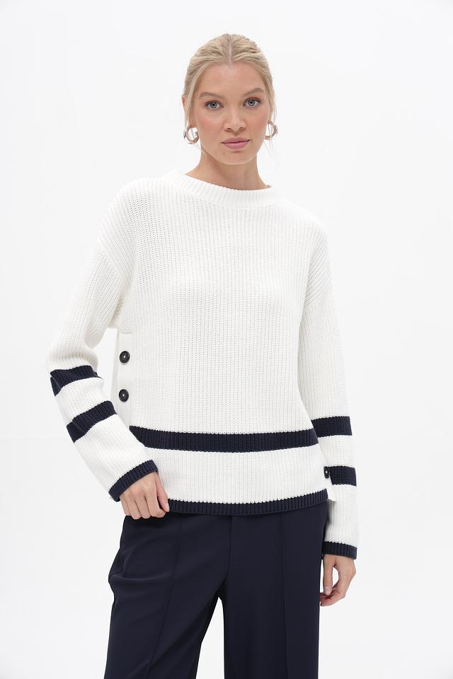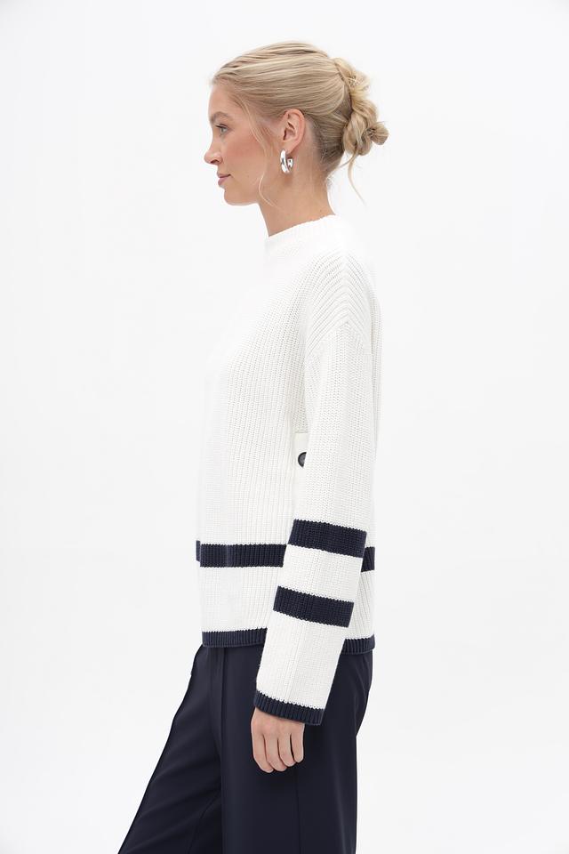 Этот стильный пуловер от бренда Oui станет отличным дополнением к вашему гардеробу. Изделие выполнено в белом цвете с широкими темно-синими полосами, расположенными на рукавах и в нижней части изделия, что придает ему особый шарм.
