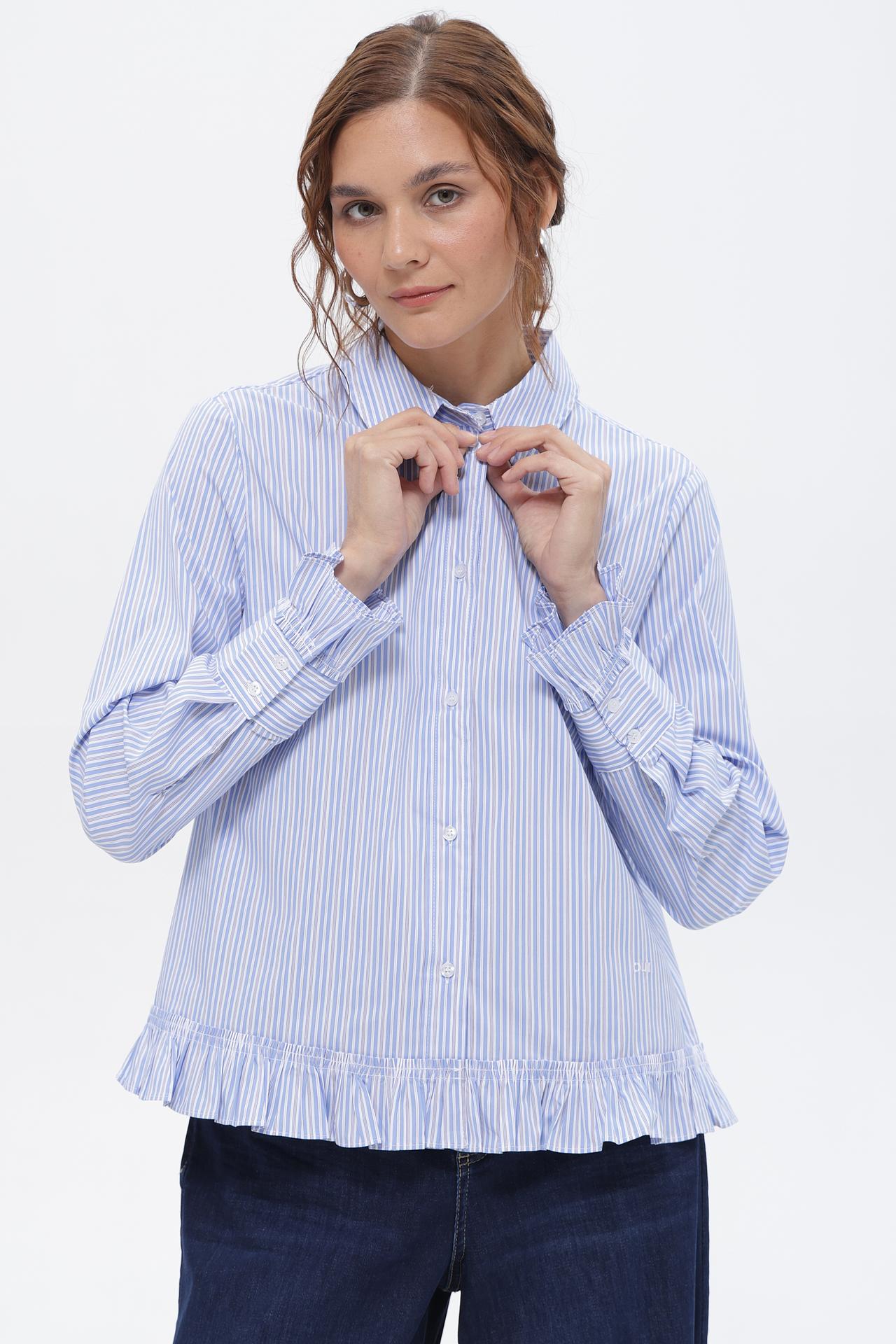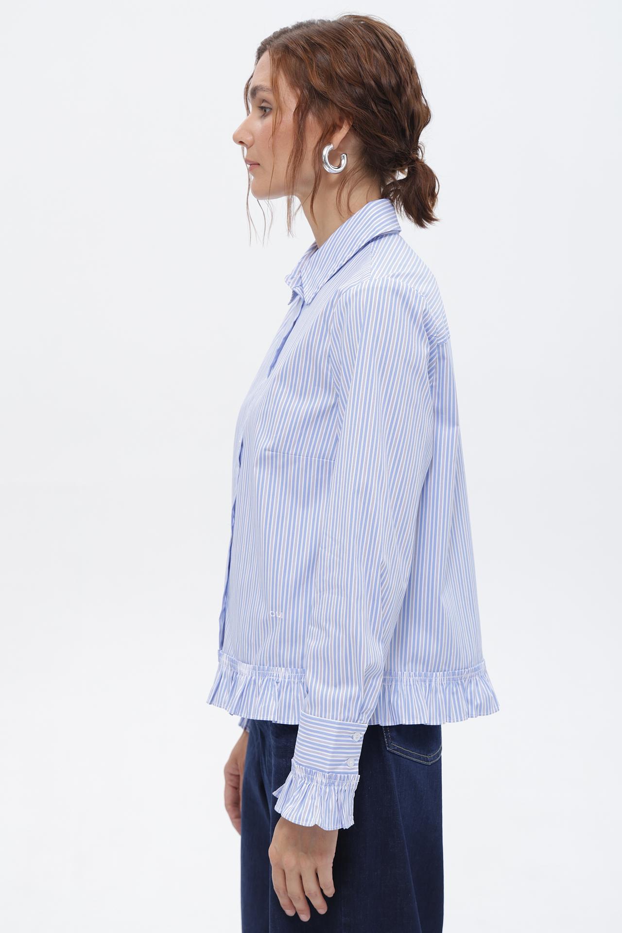 Особое внимание привлекают изящные рюши по низу изделия и на манжетах, которые придают блузе женственность и романтичность. Классический воротник и застежка на пуговицы подчеркивают элегантность модели, делая ее универсальной для различных случаев.
