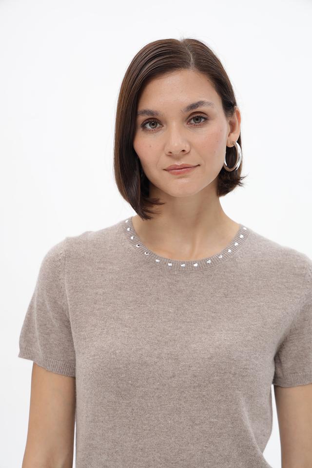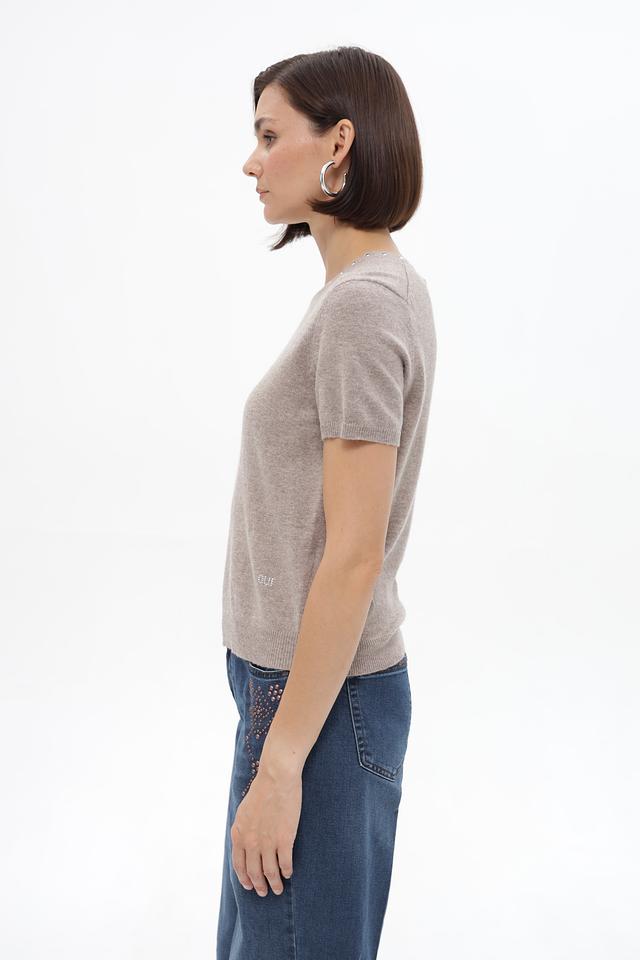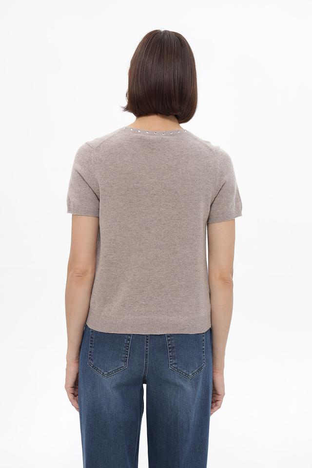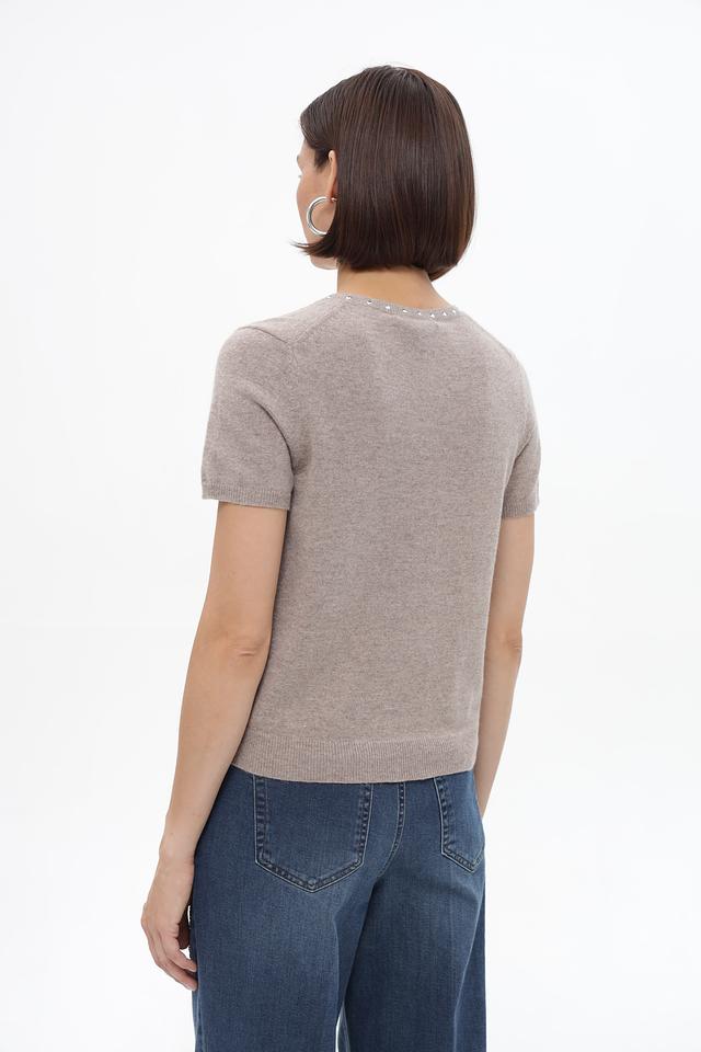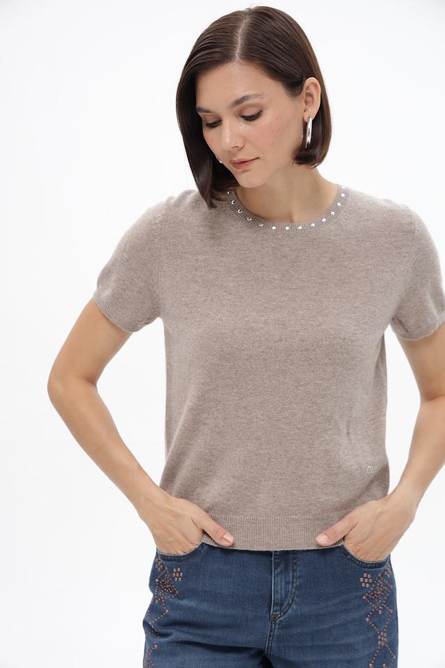 Бежевый пуловер от Oui из смесового трикотажа с коротким рукавом и декором из жемчуга. Состав: 45% полиамид, 30% вискоза, 20% шерсть, 5% кашемир. Состав: полиамид 45%, вискоза 30%, шерсть 20%, кашемир 5%