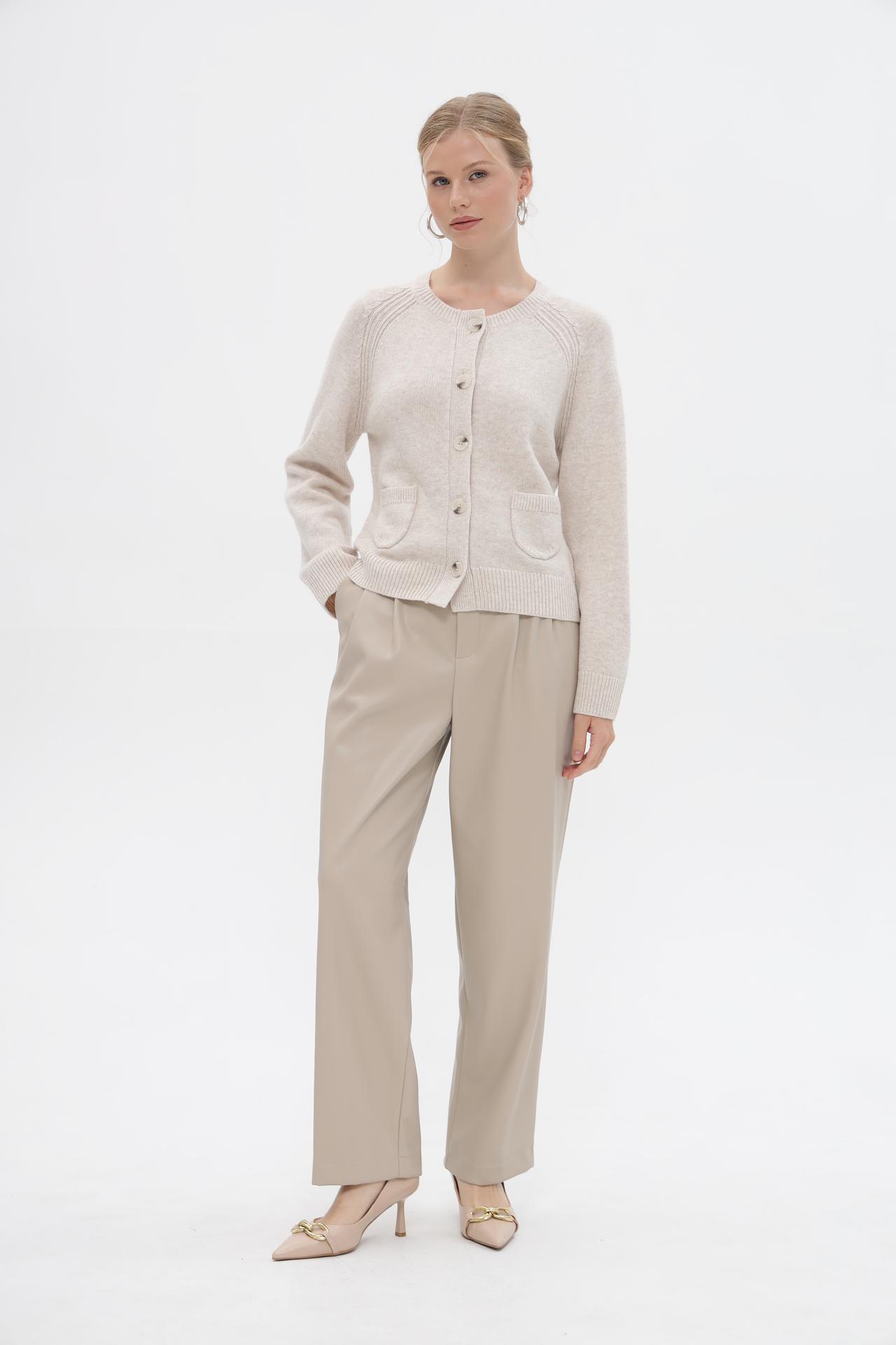 - Дизайн: Жакет выполнен в классическом стиле с круглым вырезом и застежкой на пуговицы. Акцентные детали в виде фигурных планок на кокетке и накладных карманов придают изделию изысканность.