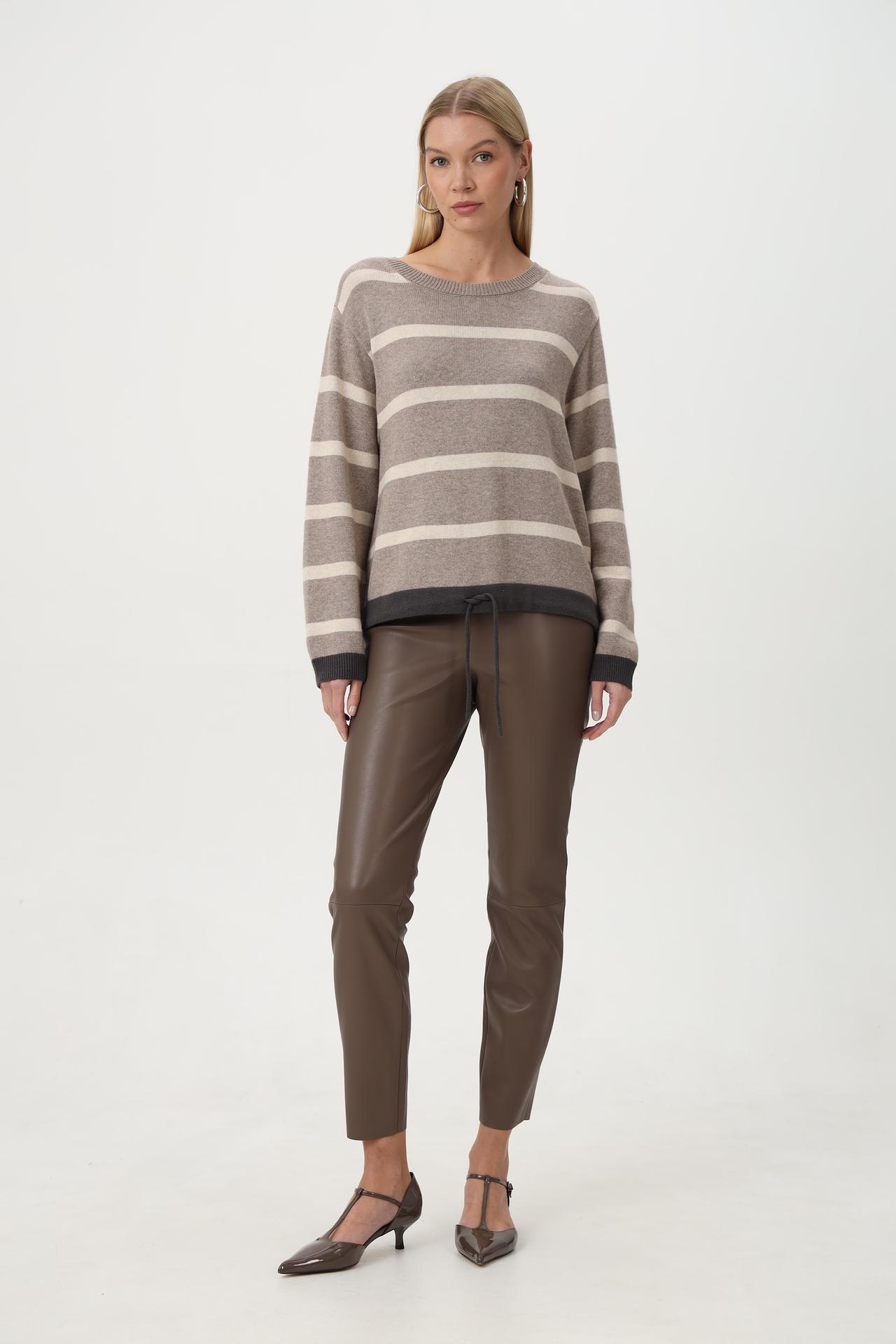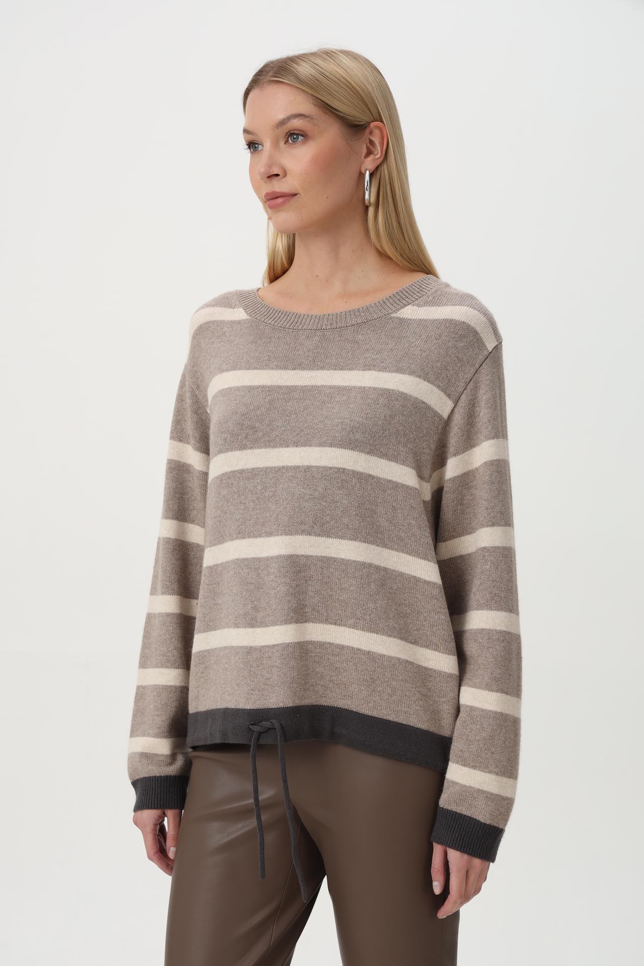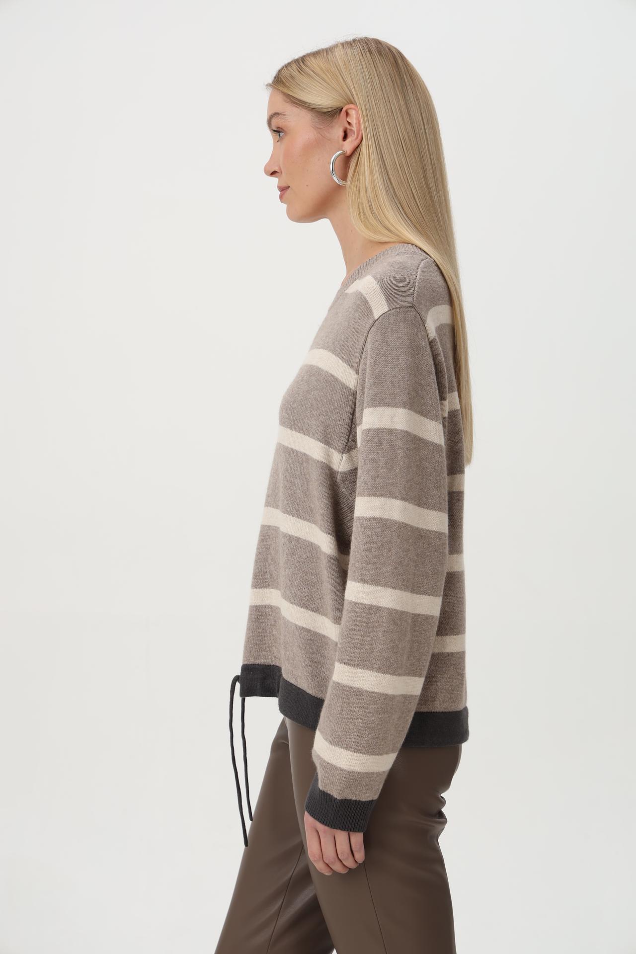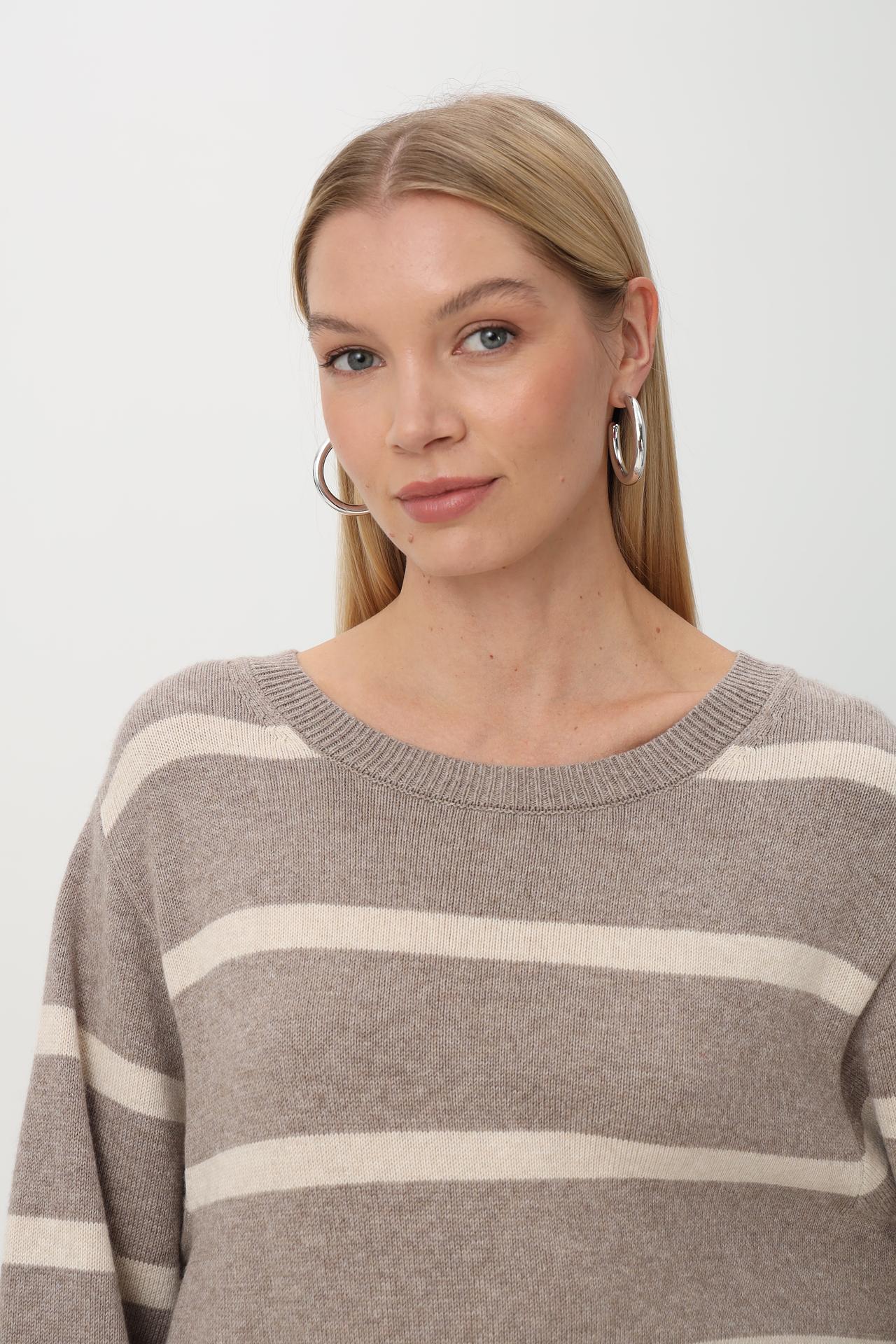 - Цвет: Универсальная расцветка в полоску, сочетающая базовые оттенки бежевого, серого и кремового, легко впишется в любой гардероб.