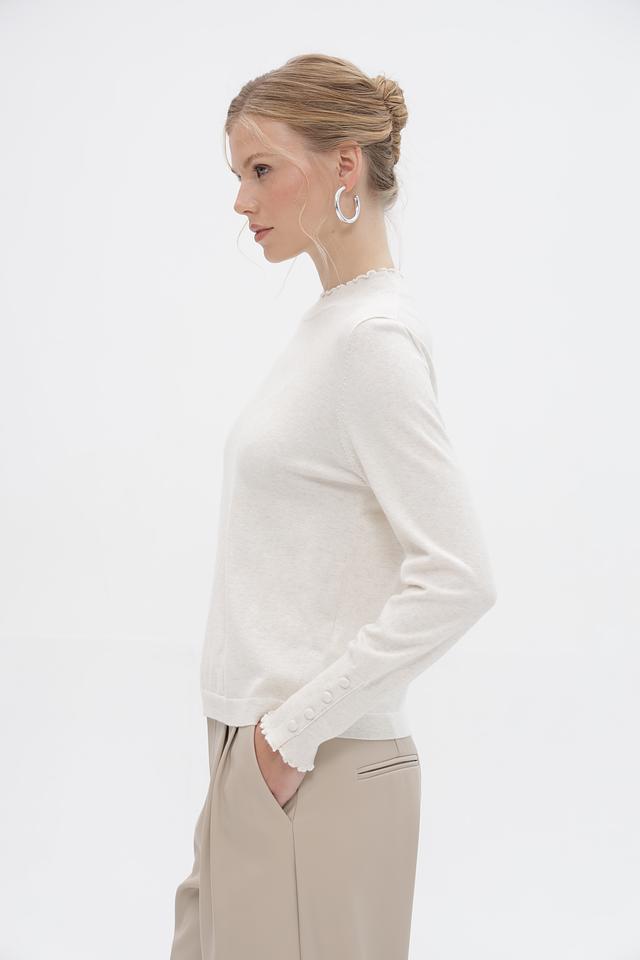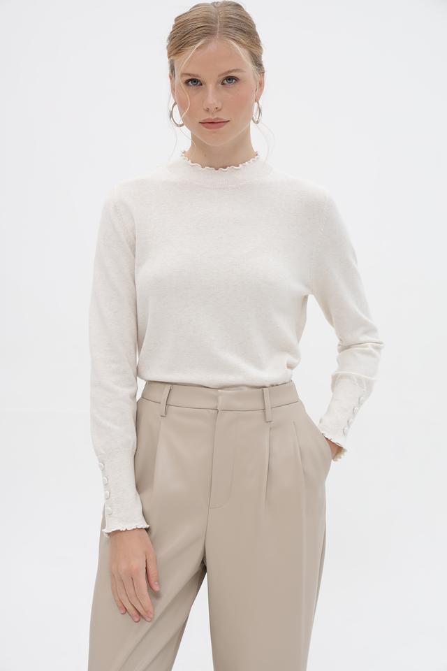 Женский пуловер Oui выполнен в нежном бежевом оттенке. Модель имеет классический силуэт и длинные рукава, дополненные изящным воланом по краю. Горловина также оформлена воланом, что придает изделию романтичный и женственный вид.