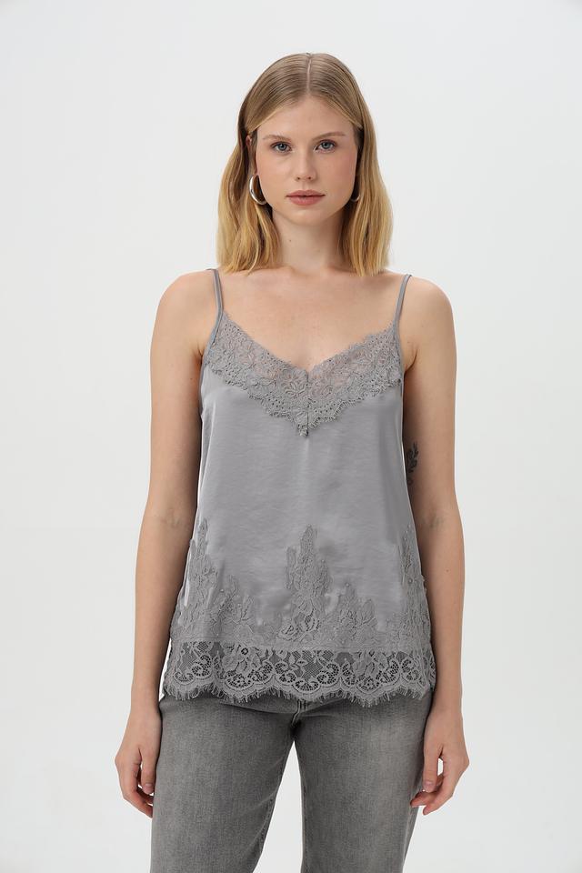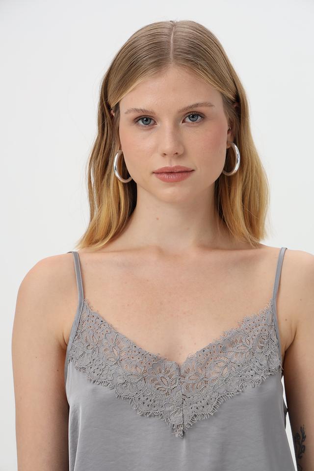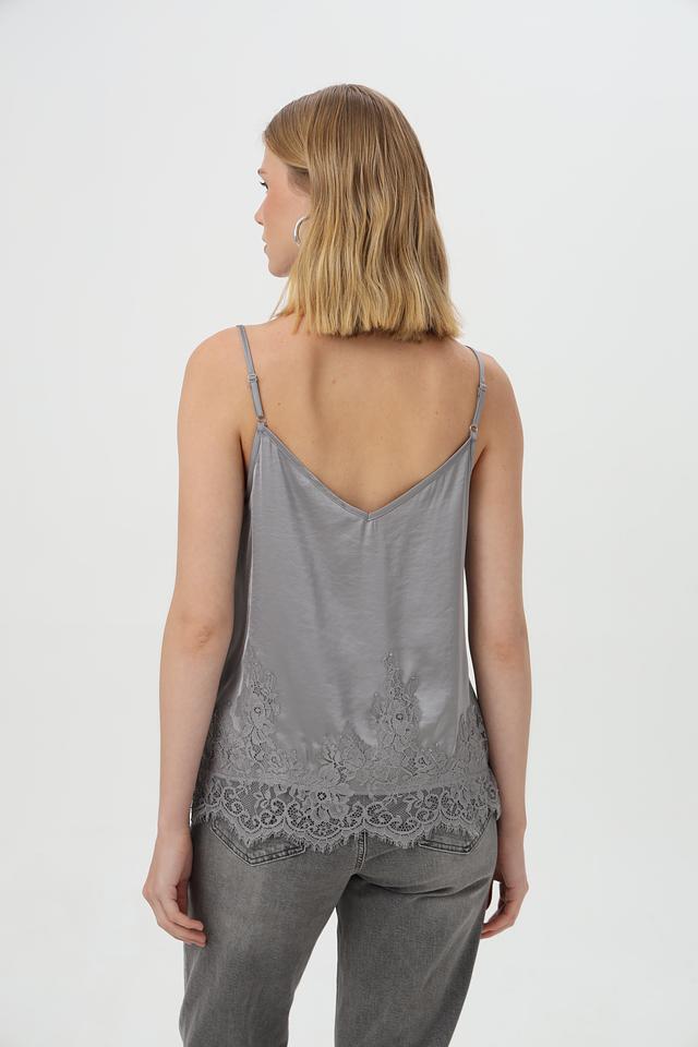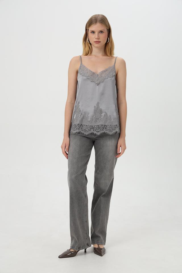 Топ имеет тонкие бретели и V-образный вырез, что придает ему изящный и женственный вид. Особое внимание привлекает деликатное кружево, украшающее верхнюю часть топа и нижний край.