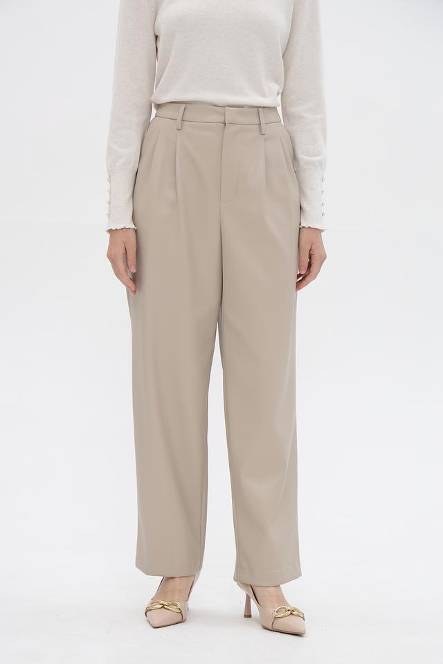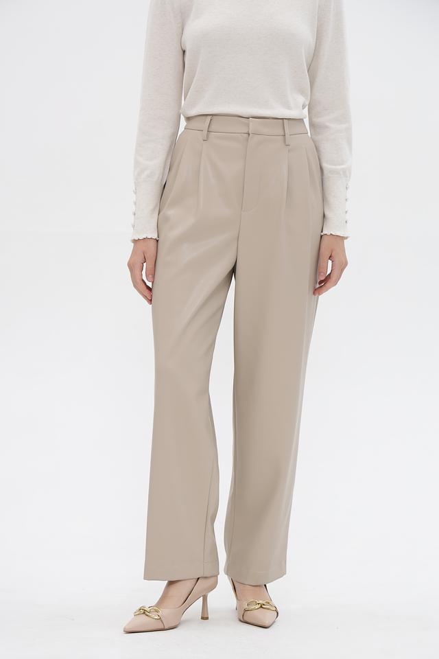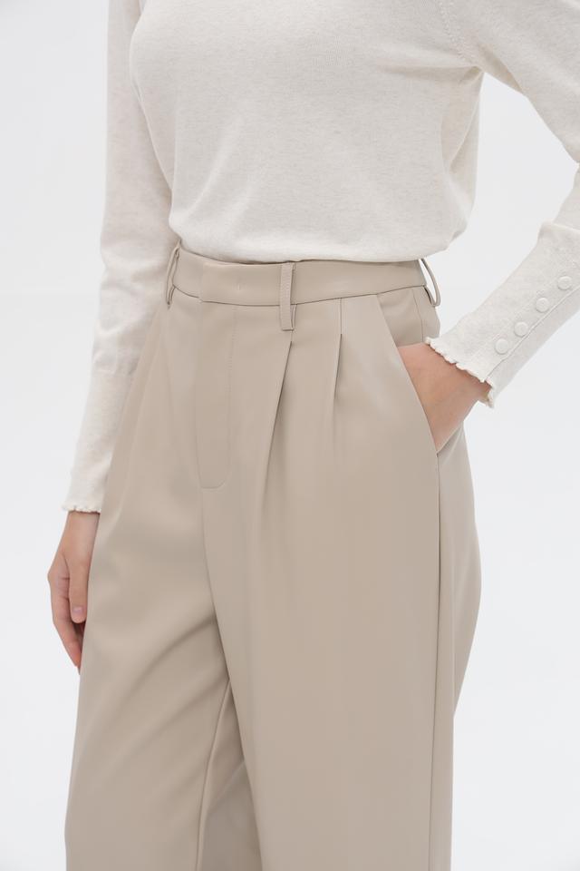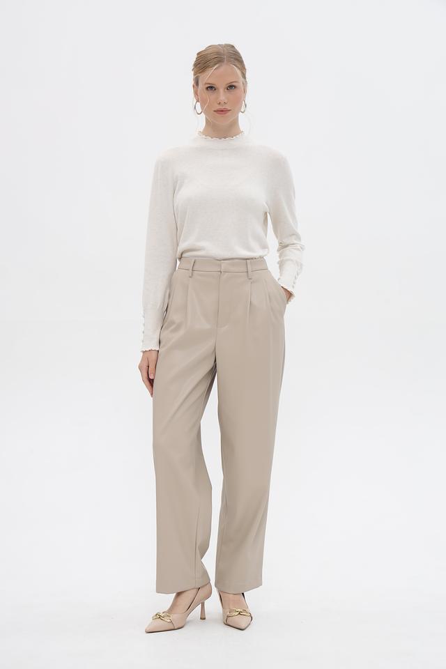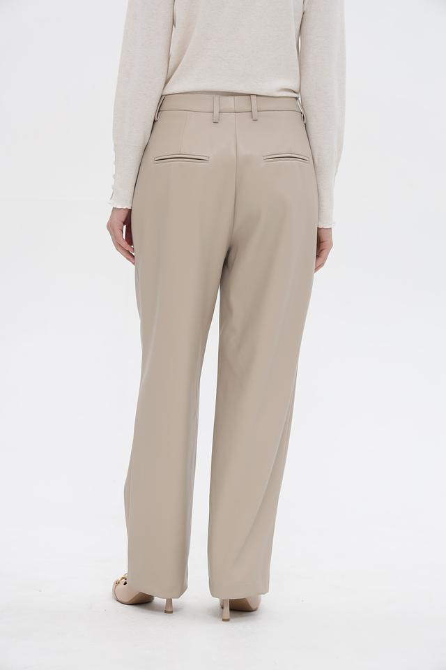 Брюки имеют завышенную талию и широкие штанины, что визуально удлиняет силуэт. Спереди расположены аккуратные складки, добавляющие образу изысканности. Застежка-молния и пуговица расположены на поясе.