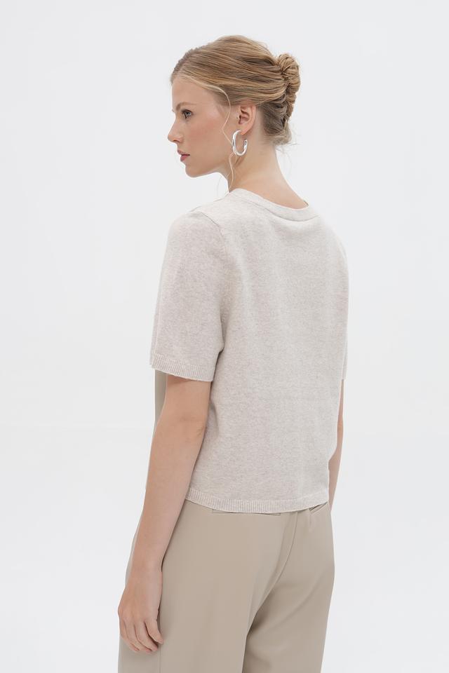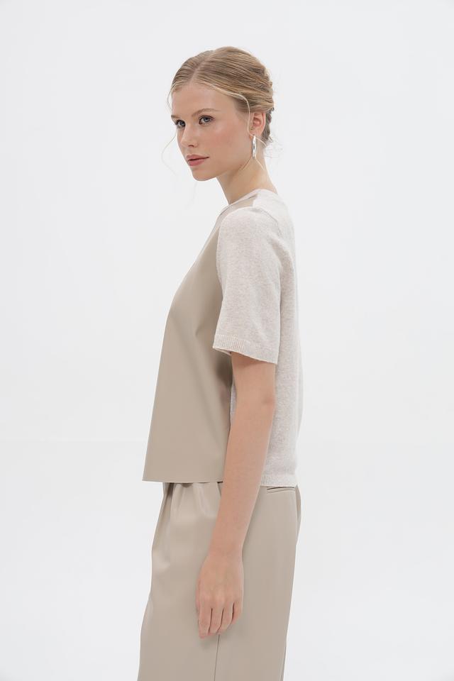 Передняя часть и верх рукавов выполнены из материала, напоминающего кожу, а задняя часть и нижняя часть рукавов – из вязаного трикотажа. На передней части пуловер украшен тисненым логотипом бренда Oui. Круглый вырез горловины и короткие рукава делают этот пуловер идеальным для теплой погоды.