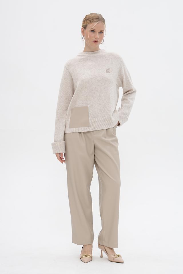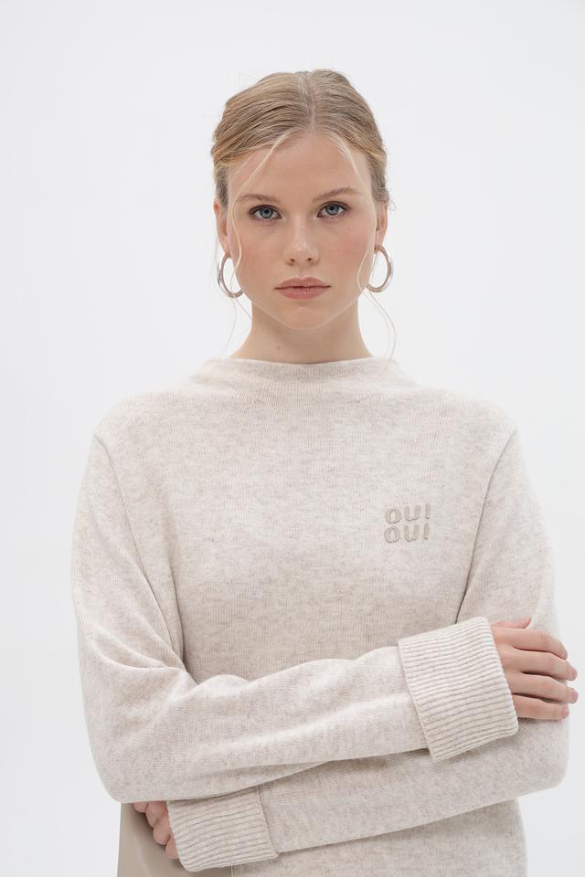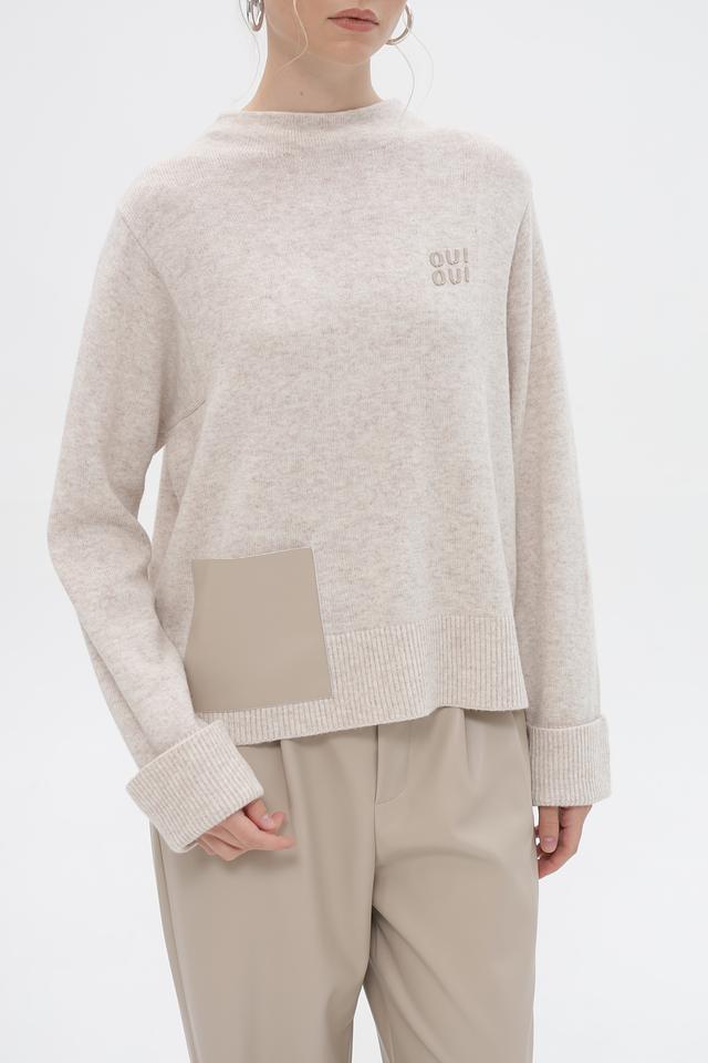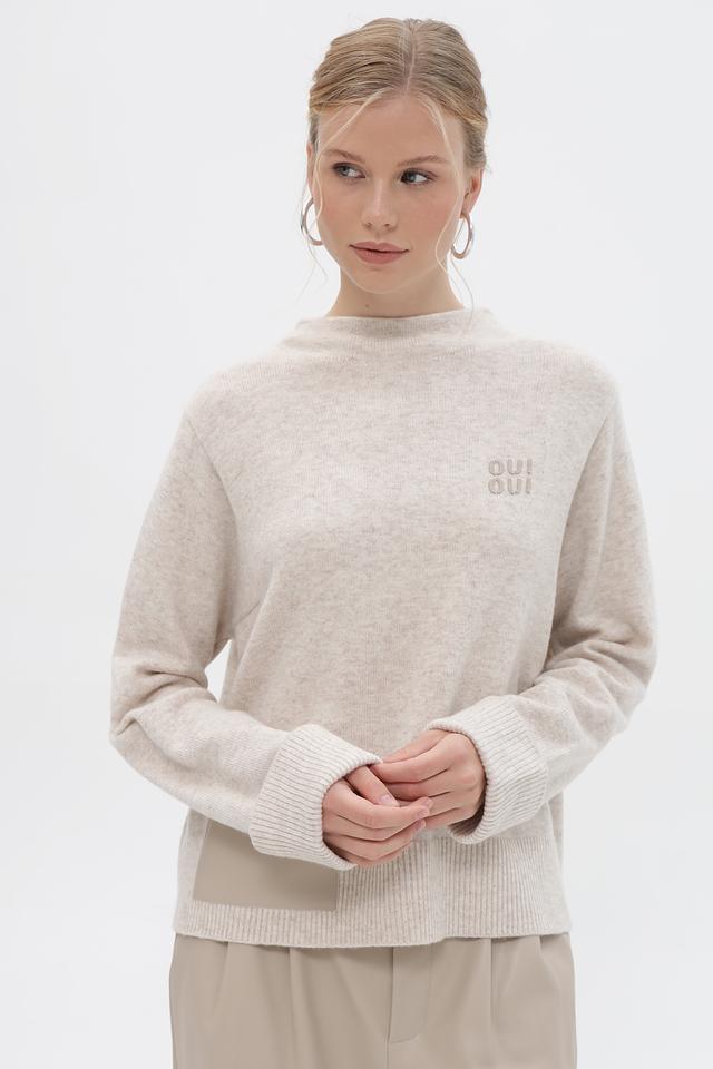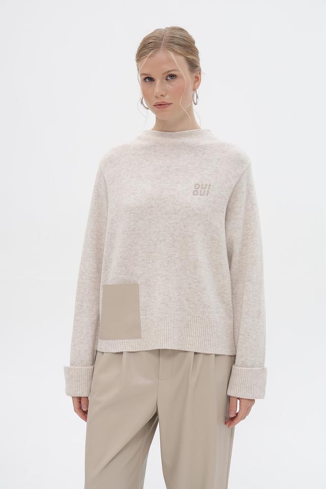 Пуловер имеет прямой крой, длинные рукава с манжетами и круглый вырез горловины. На груди расположена вышивка с логотипом бренда Oui. Сбоку изделия присутствует вставка из ткани кашкового цвета, которая добавляет оригинальности дизайну.
