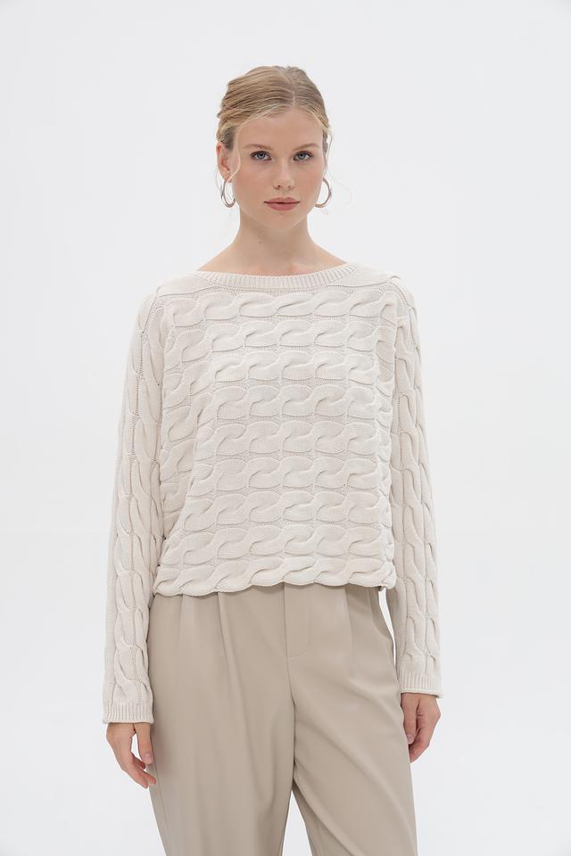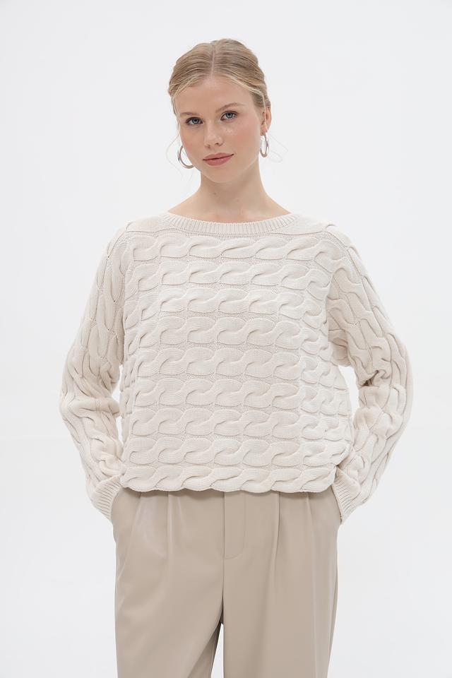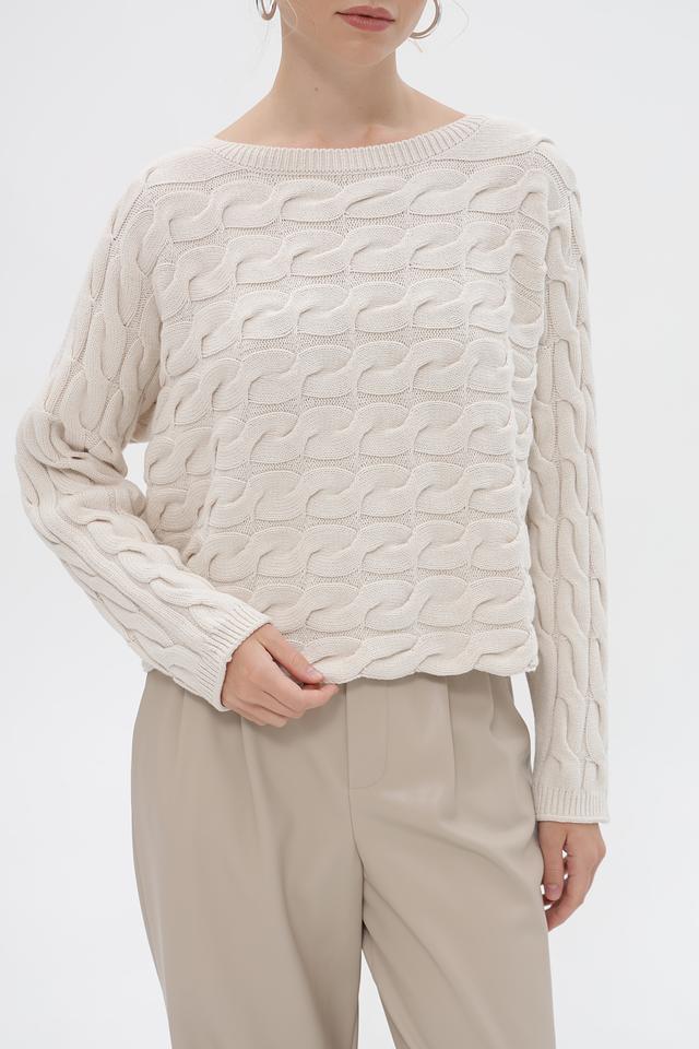 Бежевый пуловер от Oui из мягкого хлопка с акрилом, выполненный с оригинальным узором из кос. Удобный крой и приятная текстура делают этот пуловер отличным выбором для создания стильного и комфортного образа. Состав: хлопок 60%, полиакрил 40%