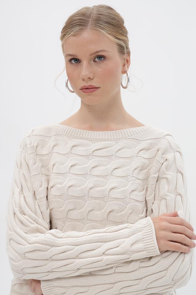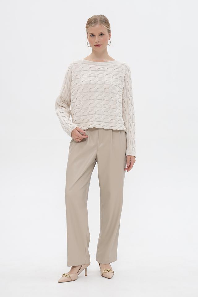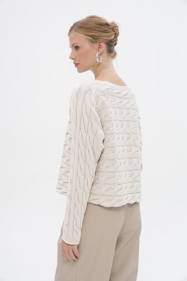 Пуловер имеет круглый вырез и длинные рукава, а его особенностью является выразительный узор в виде кос, который придает изделию оригинальность и текстуру. Прилегающий силуэт подчеркивает фигуру, не сковывая движения.