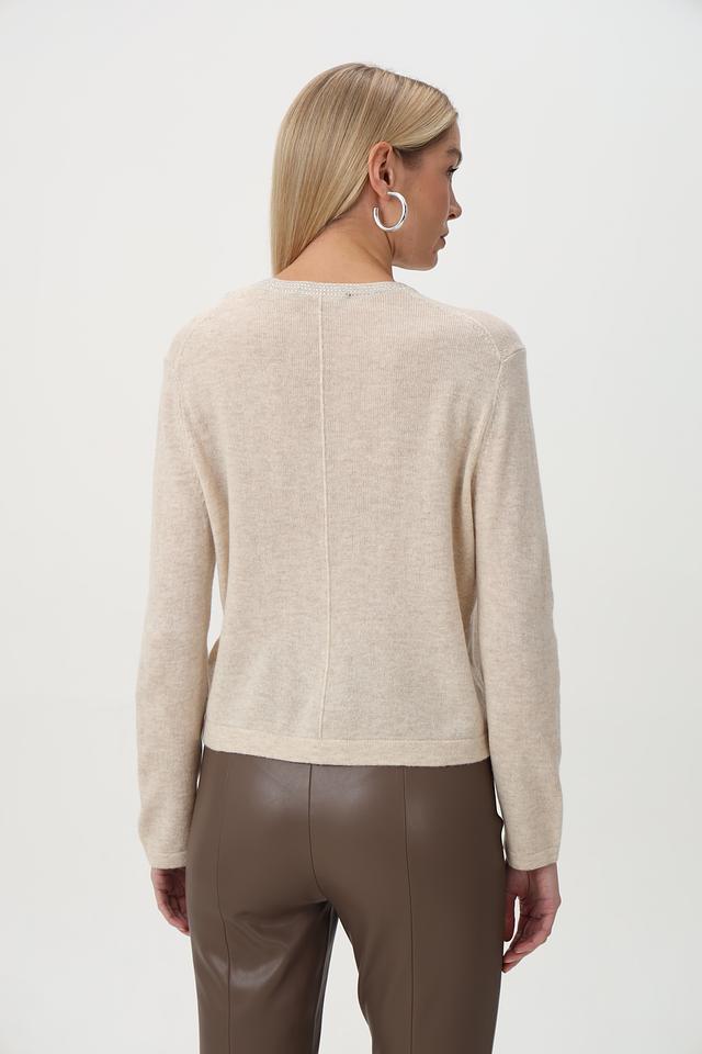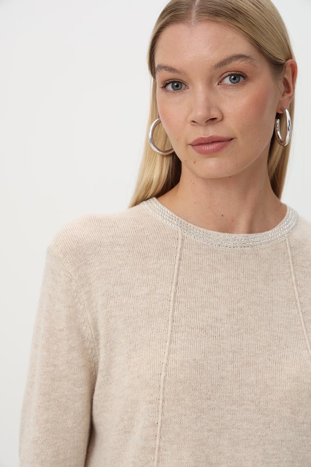 Пуловер имеет прямой крой и длинные рукава. Особенностью модели является декоративная отделка горловины, которая придает изделию элегантный вид.