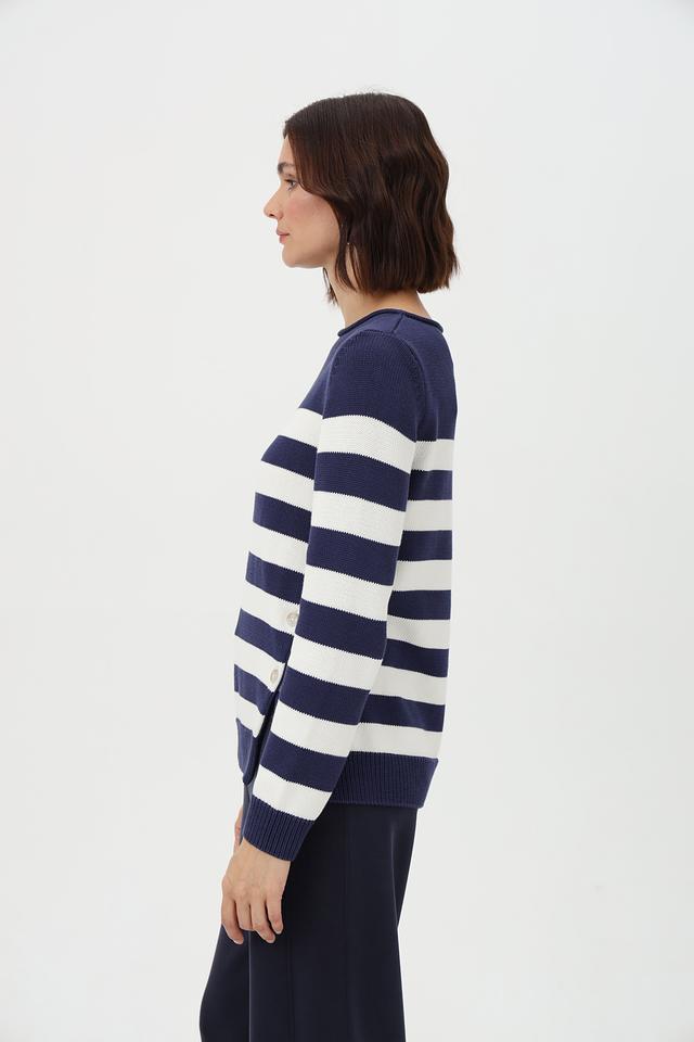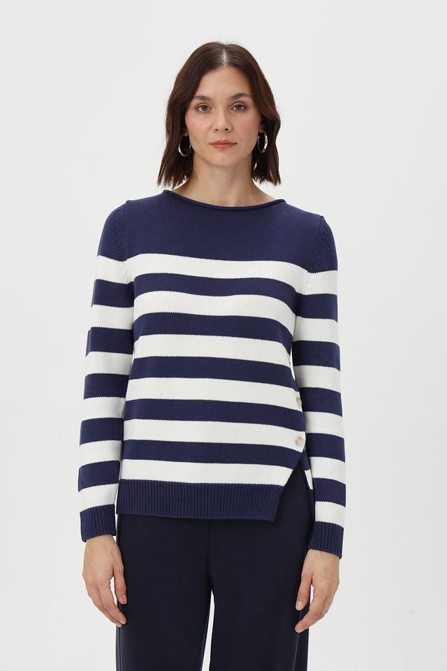 Этот пуловер от бренда Oui – прекрасный выбор для создания повседневного образа. Модель выполнена в классическом стиле с горизонтальной полоской синего и белого цветов.