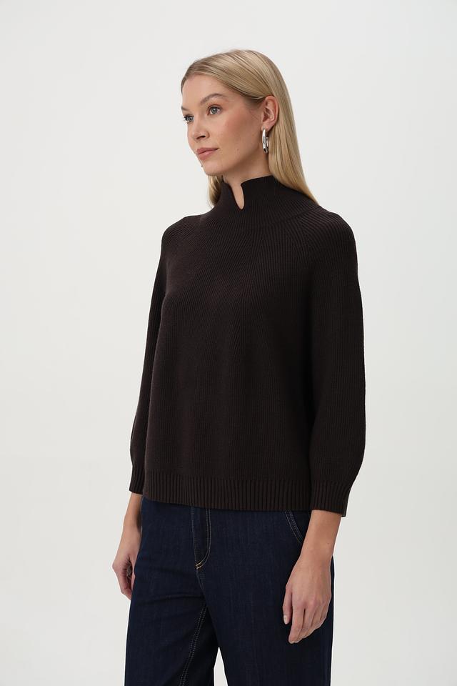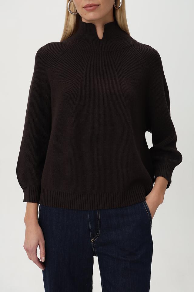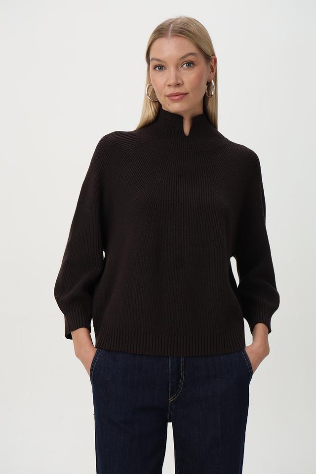 Темно-коричневый пуловер Oui с оригинальным воротником-стойкой. Выполнен из мягкой смеси вискозы, полиэстера и полиамида. Умеренный объём и рукава 3/4. Состав: вискоза 50%, полиэстер 28%, полиамид 22%