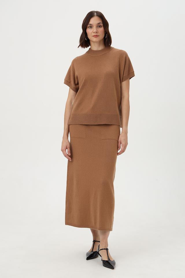 Юбка имеет прямой крой и эластичный пояс с функциональной кулиской, обеспечивающей комфортную посадку по фигуре. Сбоку предусмотрен практичный врезной карман. Изделие выполнено из высококачественного трикотажа, в состав которого входит шерсть (47%), полиамид (33%), модал (19%) и эластан (1%).