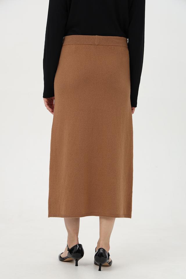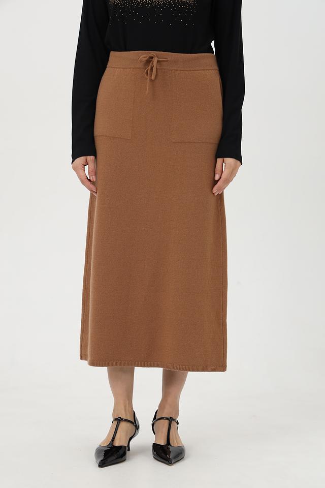 Коричневая вязаная юбка от Oui длиной миди. Изделие выполнено из смесовой шерсти, модала и полиамида, имеет эластичный пояс с кулиской и боковые карманы. Состав: шерсть 47%, полиамид 33%, модал 19%, эластан 1%